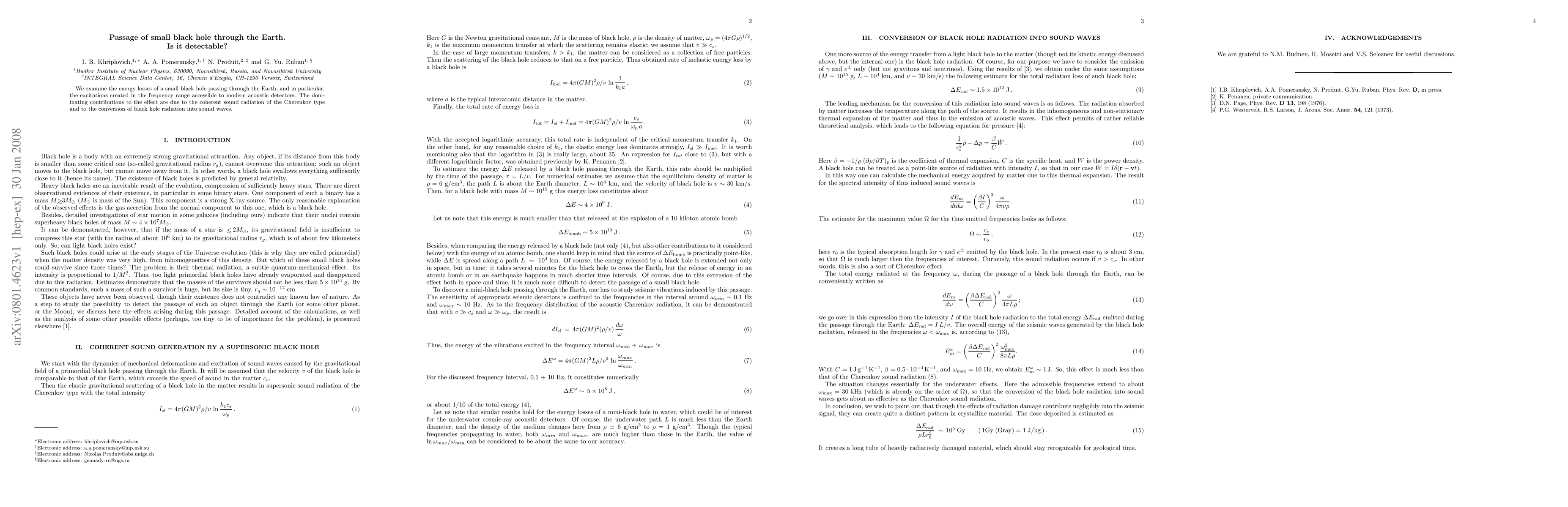 We examine the energy losses of a small black hole passing through the Earth, and in particular, the excitations created in the frequency range accessible to modern acoustic detectors. The dominating contributions to the effect are due to the coherent sound radiation of the Cherenkov type and to the conversion of black hole radiation into sound waves.