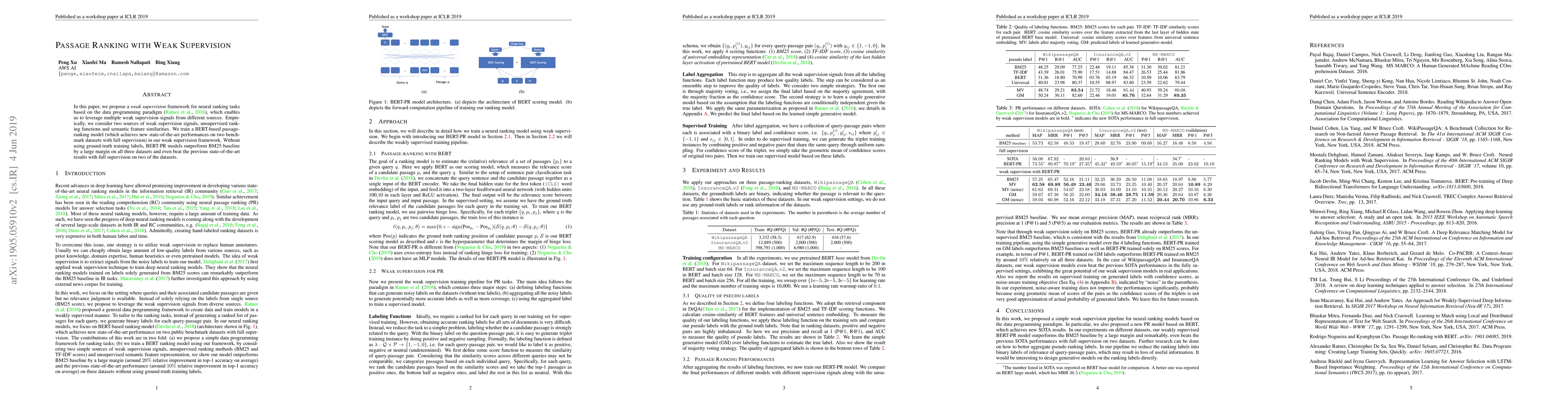 This paper introduces a weak supervision framework for neural passage-ranking tasks, leveraging unsupervised ranking functions and semantic feature similarities. The BERT-based model trained within this framework outperforms BM25 baselines and even surpasses previous state-of-the-art results on benchmark datasets without using ground-truth labels.