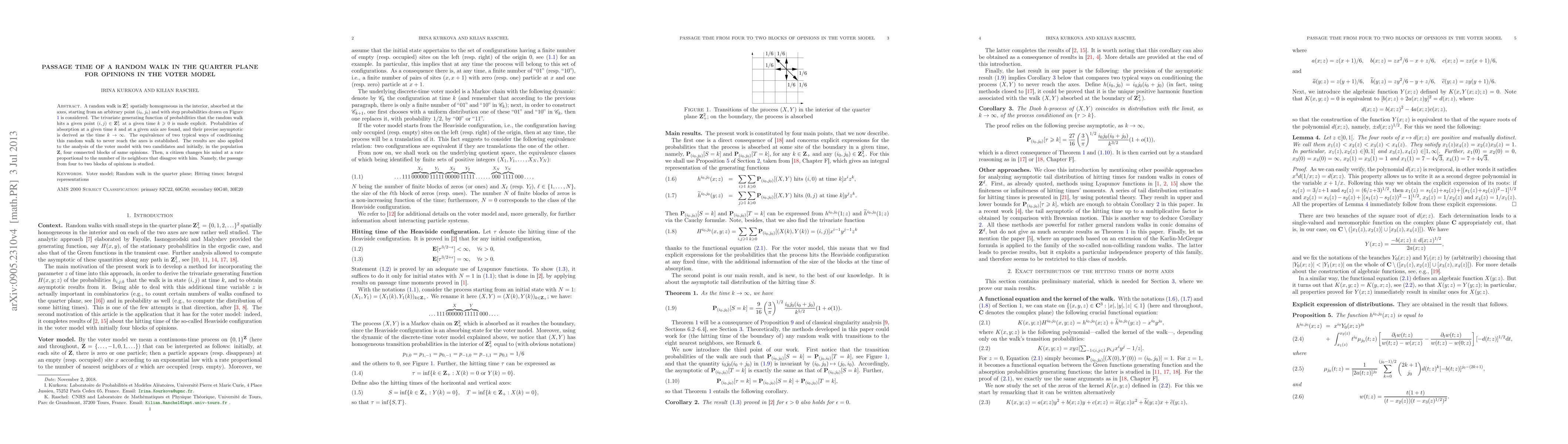 A random walk in $Z_+^2$ spatially homogeneous in the interior, absorbed at the axes, starting from an arbitrary point $(i_0,j_0)$ and with step probabilities drawn on Figure 1 is considered. The trivariate generating function of probabilities that the random walk hits a given point $(i,j)\in Z_+^2$ at a given time $k\geq 0$ is made explicit. Probabilities of absorption at a given time $k$ and at a given axis are found, and their precise asymptotic is derived as the time $k\to\infty$. The equivalence of two typical ways of conditioning this random walk to never reach the axes is established. The results are also applied to the analysis of the voter model with two candidates and initially, in the population $Z$, four connected blocks of same opinions. Then, a citizen changes his mind at a rate proportional to the number of its neighbors that disagree with him. Namely, the passage from four to two blocks of opinions is studied.