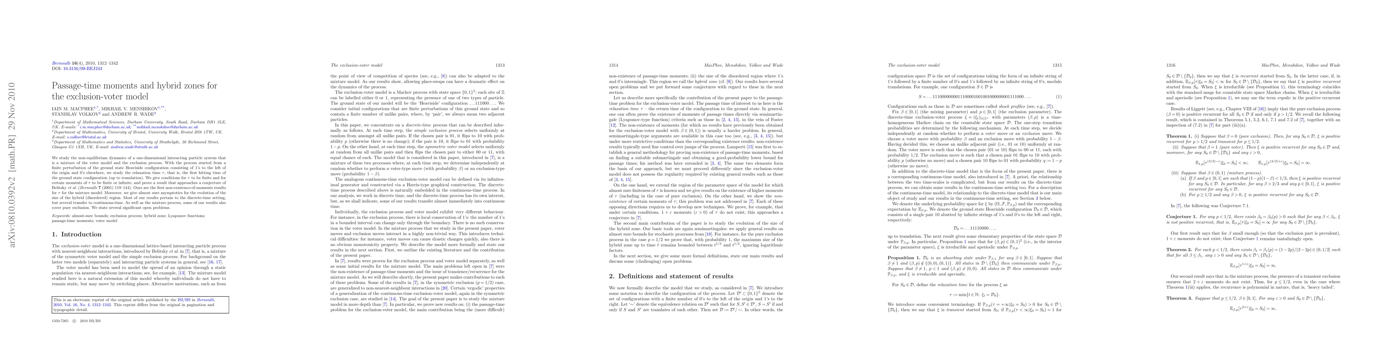 This research paper studies the non-equilibrium dynamics of a mixture model combining the voter model and exclusion process, focusing on passage-time moments and hybrid zones for the ground state configuration, with implications for understanding relaxation times and asymptotic behaviors in one-dimensional interacting particle systems.