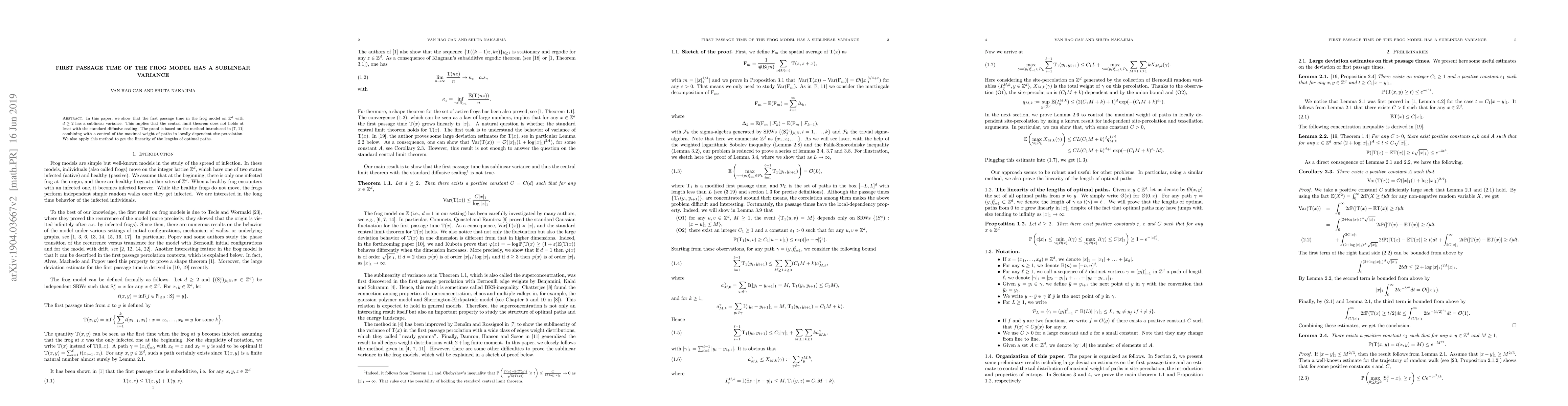 This paper demonstrates that the first passage time in the frog model on $\Z^d$ ($d\geq 2$) exhibits sublinear variance, indicating the central limit theorem does not apply under standard diffusive scaling. The proof leverages methods from \cite{BRo, DHS} and controls the maximal weight of paths in site-percolation.
