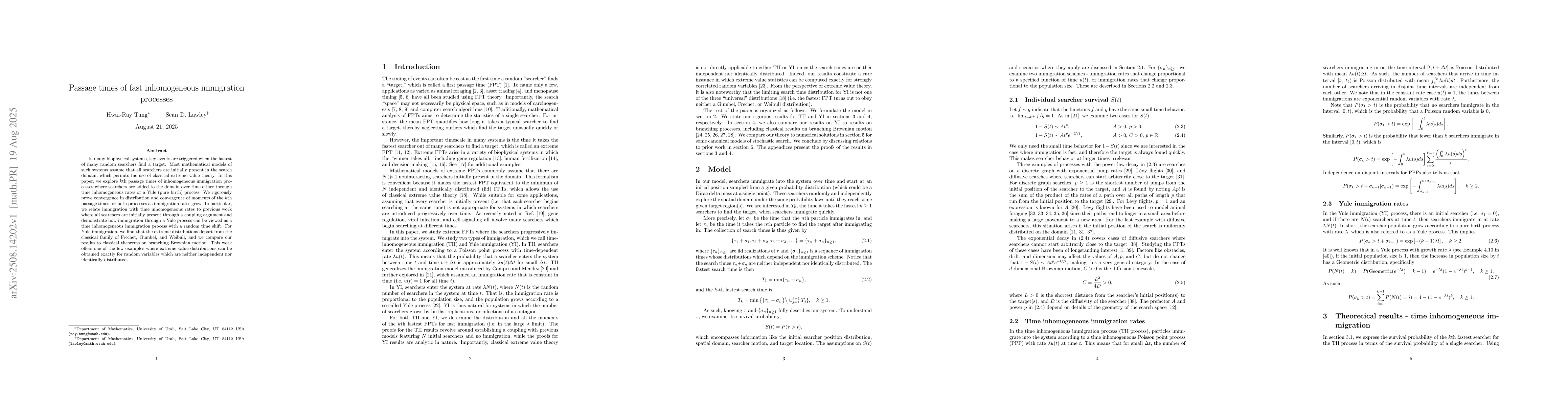 The paper explores $k$th passage times of inhomogeneous immigration processes where searchers are added to the domain over time, either through time inhomogeneous rates or a Yule (pure birth) process. It rigorously proves convergence in distribution and convergence of moments of the $k$th passage times for both processes as immigration rates grow.