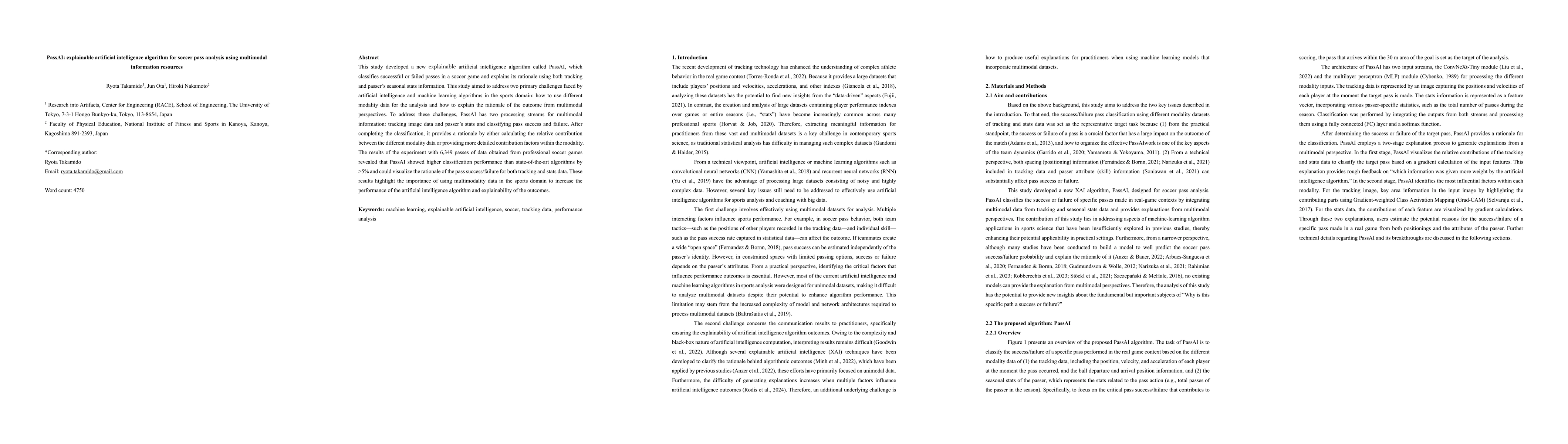 This study developed PassAI, an explainable AI algorithm that classifies soccer passes as successful or failed using tracking image data and passer's stats. PassAI provides rationale for its classifications by calculating relative contributions of different modalities.