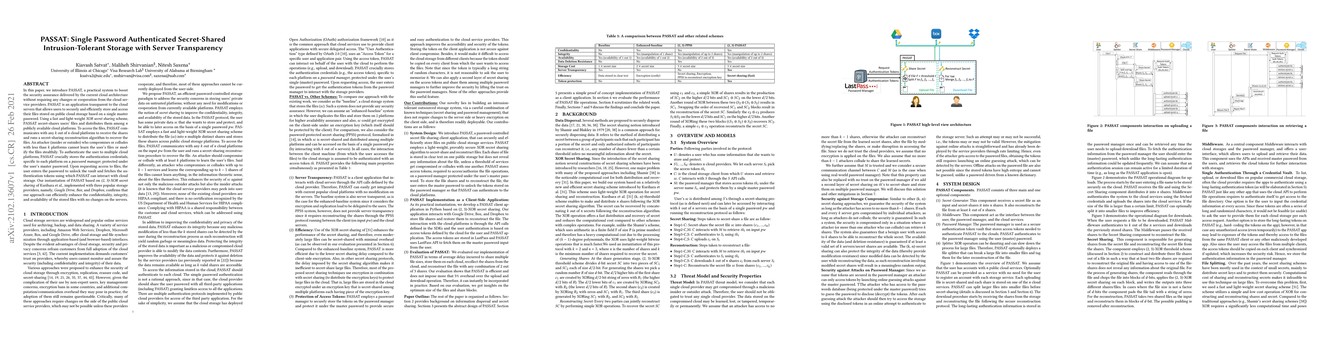 PASSAT enhances cloud storage security through a single master password, employing XOR secret sharing to distribute and reconstruct encrypted files across multiple cloud platforms without requiring changes from providers. It ensures confidentiality, integrity, and availability by authenticating users via a password manager, protected under the master password.