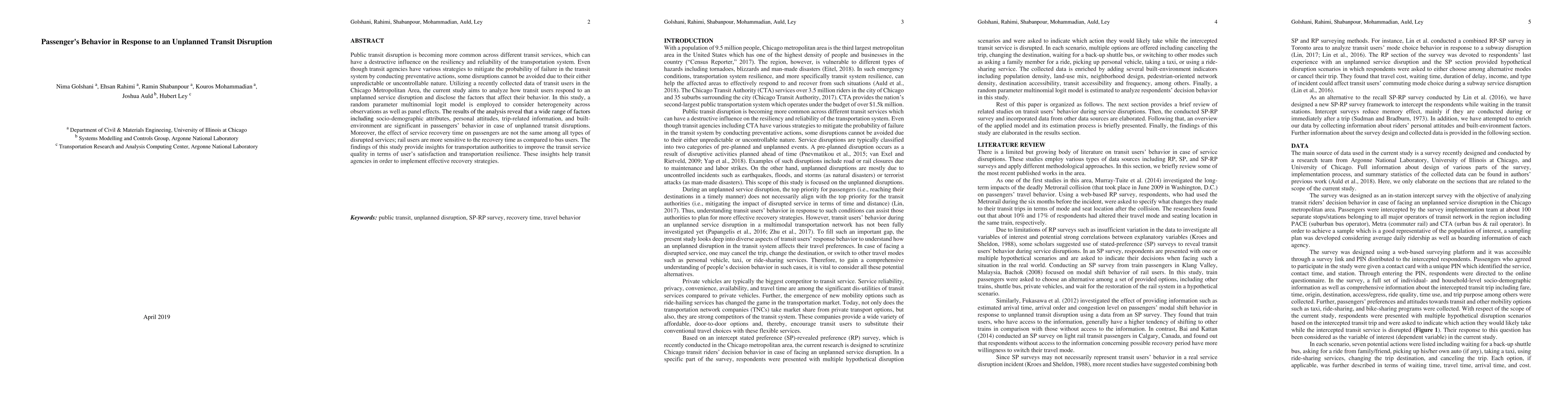 Public transit disruption is becoming more common across different transit services, which can have a destructive influence on the resiliency and reliability of the transportation system. Utilizing a recently collected data of transit users in the Chicago Metropolitan Area, the current study aims to analyze how transit users respond to unplanned service disruption and disclose the factors that affect their behavior.