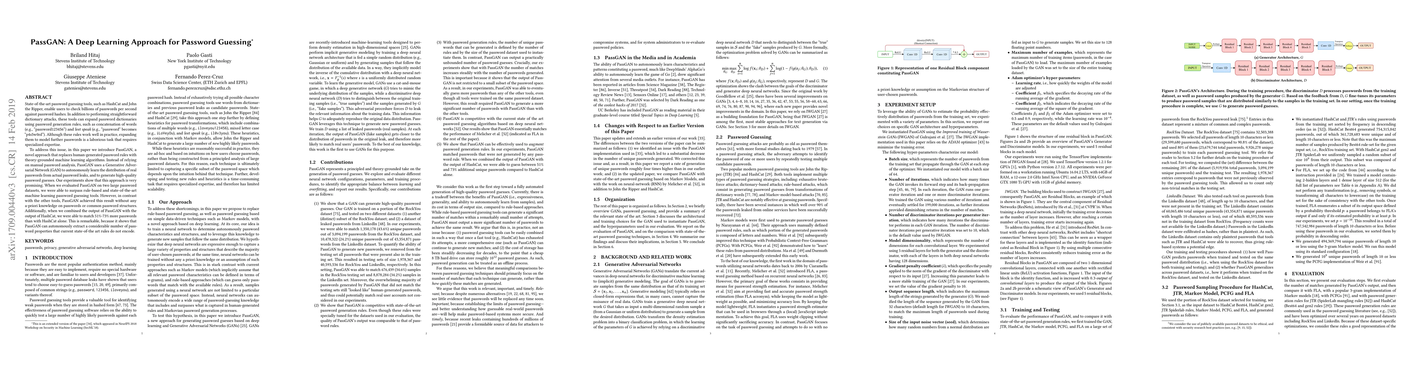 PassGAN employs a Generative Adversarial Network to autonomously learn the distribution of real passwords from leaks, surpassing traditional rule-based and machine learning password guessing tools. Combined with HashCat, it matches 51%-73% more passwords, demonstrating its ability to extract unique password properties.