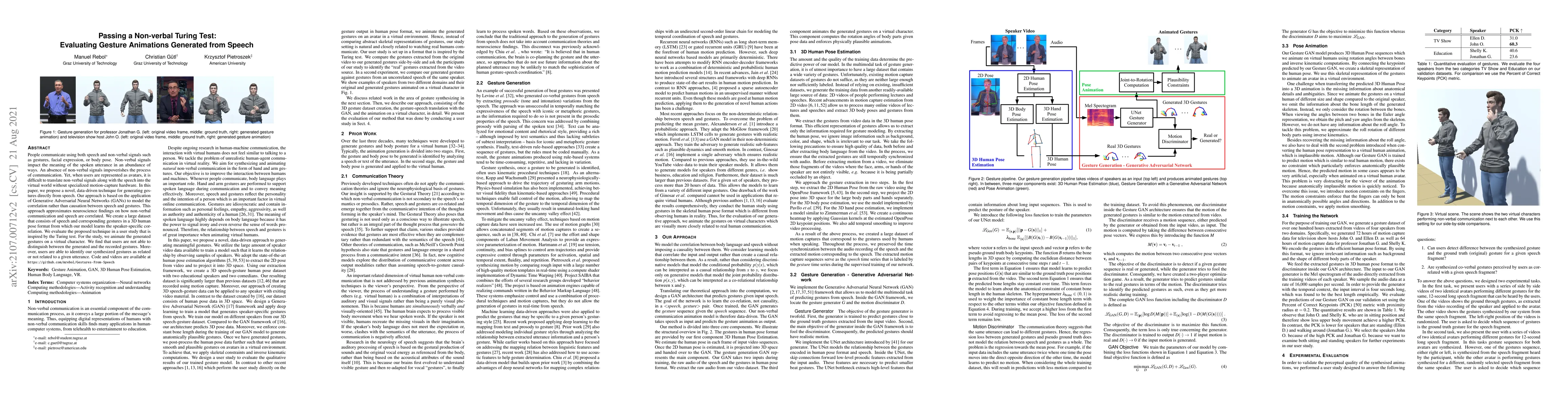 People communicate using both speech and non-verbal signals such as gestures, face expression or body pose. Non-verbal signals impact the meaning of the spoken utterance in an abundance of ways. An absence of non-verbal signals impoverishes the process of communication. Yet, when users are represented as avatars, it is difficult to translate non-verbal signals along with the speech into the virtual world without specialized motion-capture hardware. In this paper, we propose a novel, data-driven technique for generating gestures directly from speech. Our approach is based on the application of Generative Adversarial Neural Networks (GANs) to model the correlation rather than causation between speech and gestures. This approach approximates neuroscience findings on how non-verbal communication and speech are correlated. We create a large dataset which consists of speech and corresponding gestures in a 3D human pose format from which our model learns the speaker-specific correlation. We evaluate the proposed technique in a user study that is inspired by the Turing test. For the study, we animate the generated gestures on a virtual character. We find that users are not able to distinguish between the generated and the recorded gestures. Moreover, users are able to identify our synthesized gestures as related or not related to a given utterance. Code and videos are available at https://github.com/mrebol/Gestures-From-Speech
