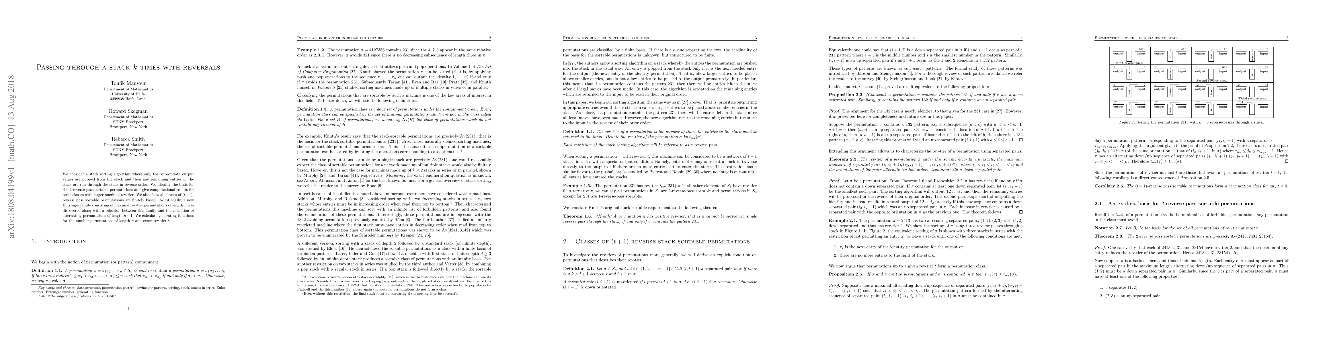 Researchers developed a new stack sorting algorithm with reversals, finding classes of permutations that can be sorted in 2 or (t+1) reverse passes, and discovered a new family of Entringer permutations related to alternating permutations.
