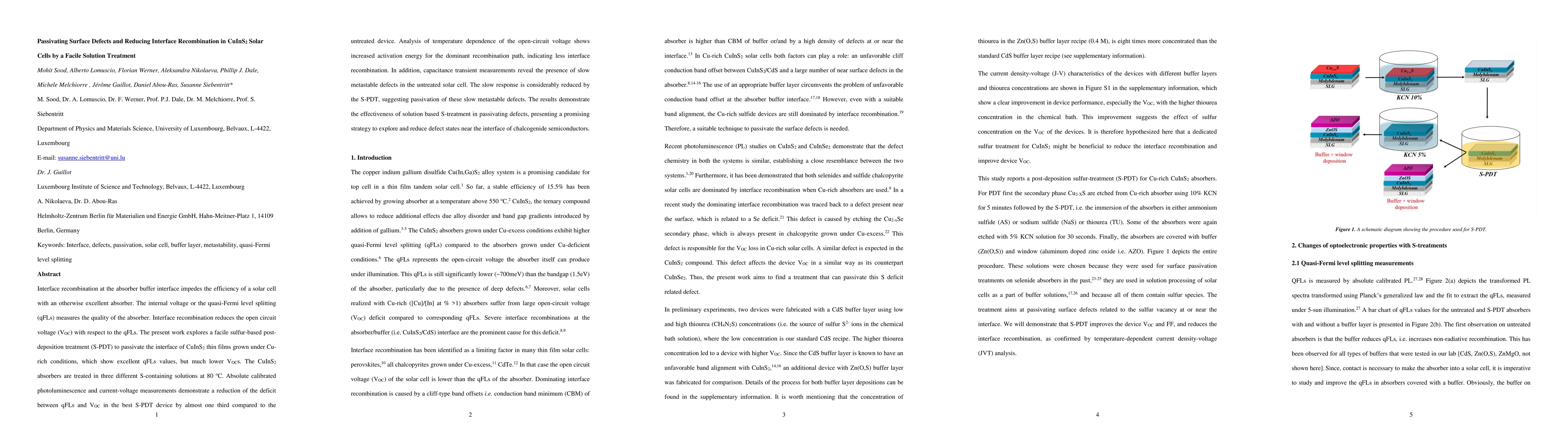 This paper investigates a sulfur-based post-deposition treatment (S-PDT) to passivate surface defects in CuInS2 solar cells, significantly reducing interface recombination and improving the open circuit voltage by almost one third. The study demonstrates the S-PDT's effectiveness in passivating slow metastable defects and reducing the recombination path activation energy.