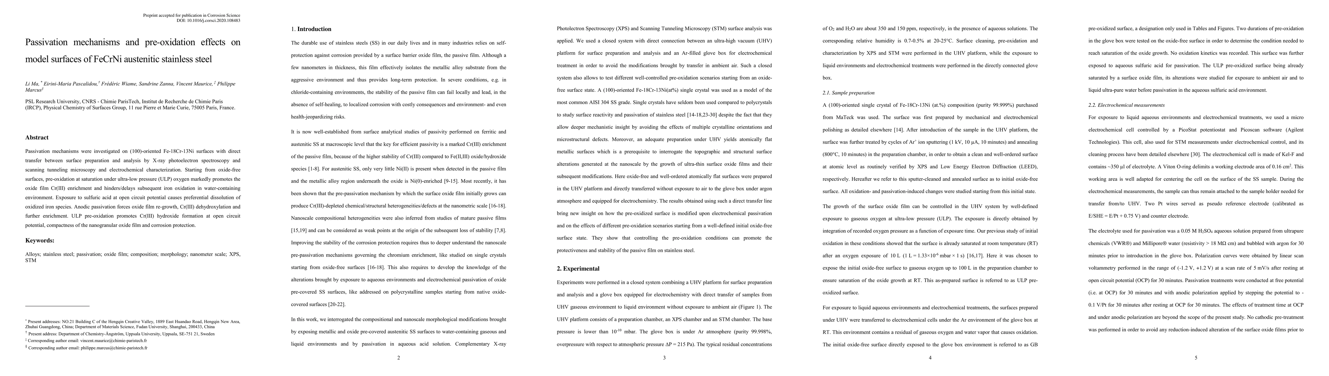 This study investigates the passivation mechanisms and pre-oxidation effects on FeCrNi austenitic stainless steel, revealing that pre-oxidation enhances Cr(III) enrichment and delays iron oxidation, while anodic passivation promotes Cr(III) hydroxide formation and improves corrosion resistance.