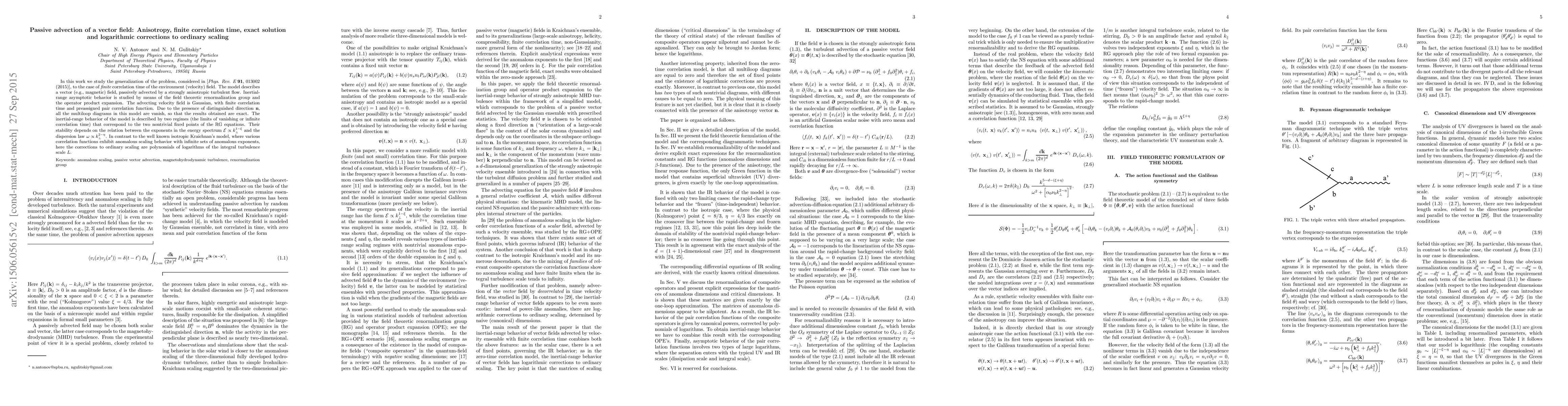 In this work we study the generalization of the problem, considered in [{\it Phys. Rev. E} {\bf 91}, 013002 (2015)], to the case of {\it finite} correlation time of the environment (velocity) field. The model describes a vector (e.g., magnetic) field, passively advected by a strongly anisotropic turbulent flow. Inertial-range asymptotic behavior is studied by means of the field theoretic renormalization group and the operator product expansion. The advecting velocity field is Gaussian, with finite correlation time and preassigned pair correlation function. Due to the presence of distinguished direction ${\bf n}$, all the multiloop diagrams in this model are vanish, so that the results obtained are exact. The inertial-range behavior of the model is described by two regimes (the limits of vanishing or infinite correlation time) that correspond to the two nontrivial fixed points of the RG equations. Their stability depends on the relation between the exponents in the energy spectrum ${\cal E} \propto k_{\bot}^{1-\xi}$ and the dispersion law $\omega \propto k_{\bot}^{2-\eta}$. In contrast to the well known isotropic Kraichnan's model, where various correlation functions exhibit anomalous scaling behavior with infinite sets of anomalous exponents, here the corrections to ordinary scaling are polynomials of logarithms of the integral turbulence scale $L$.