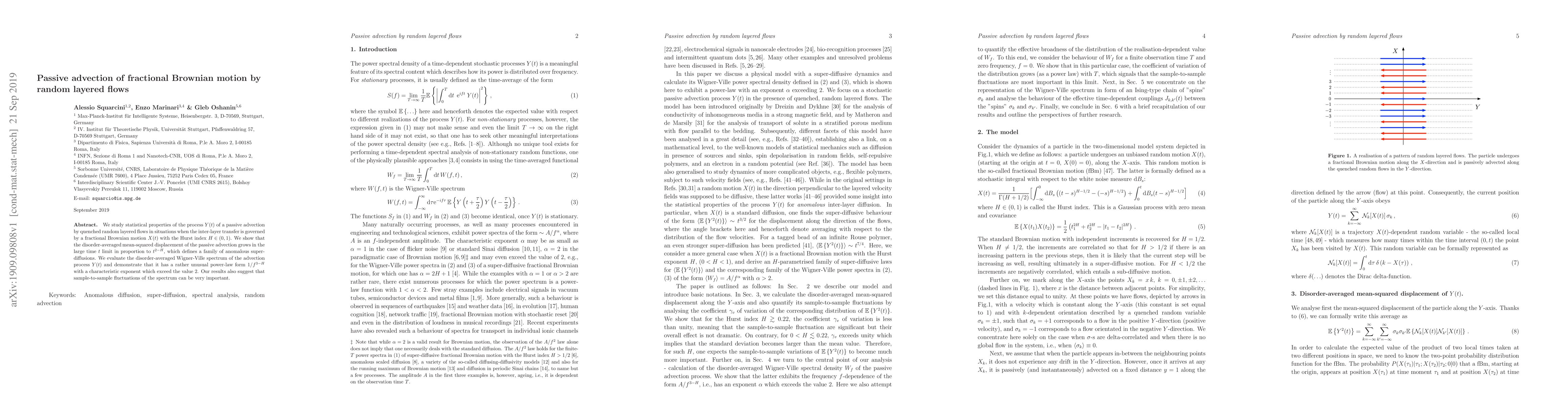 We study statistical properties of the process $Y(t)$ of a passive advection by quenched random layered flows in situations when the inter-layer transfer is governed by a fractional Brownian motion $X(t)$ with the Hurst index $H \in (0,1)$. We show that the disorder-averaged mean-squared displacement of the passive advection grows in the large time $t$ limit in proportion to $t^{2 - H}$, which defines a family of anomalous super-diffusions. We evaluate the disorder-averaged Wigner-Ville spectrum of the advection process $Y(t)$ and demonstrate that it has a rather unusual power-law form $1/f^{3 - H}$ with a characteristic exponent which exceed the value $2$. Our results also suggest that sample-to-sample fluctuations of the spectrum can be very important.