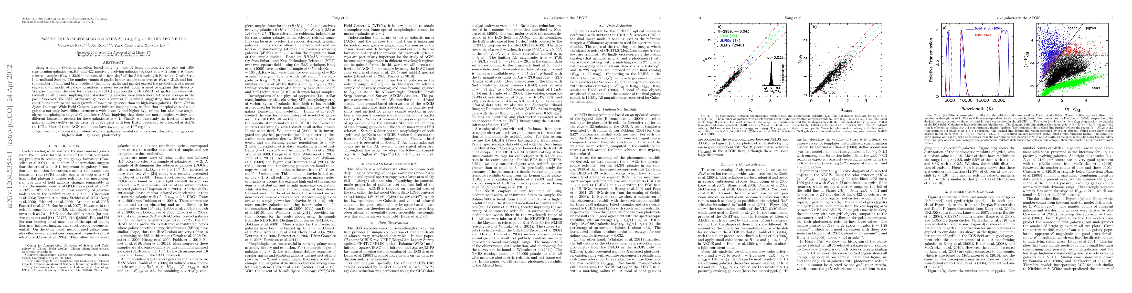 Using a simple two-color selection based on $g$-, $z$-, and $K$-band photometry, we pick out 1609 star-forming galaxies (sgzKs) and 422 passively evolving galaxies (pgzKs) at z\sim2$ from a $K$-band-selected sample ($K_{\rm AB} < 22.0$) in an area of $\sim 0.44$ deg$^{2}$ of the All-wavelength Extended Groth Strip International Survey. The number counts of pgzKs\ in our sample turn over at $K_{\rm AB} \sim 21.0$, and both the number of faint and bright objects (including sgzKs\ and pgzKs) exceed the predictions of a recent semi-analytic model of galaxy formation, a more successful model is need to explain this diversity. We also find that the star formation rate (SFR) and specific SFR (sSFR) of sgzKs\ increases with redshift at all masses, implying that star-forming galaxies were much more active on average in the past. Moreover, the sSFR of massive galaxies is lower at all redshifts, suggesting that star formation contributes more to the mass growth of low-mass galaxies than to high-mass galaxies. From {\it Hubble Space Telescope} Wide Field Camera 3 near-infrared imaging data, we find that morphologies of $z\sim2$ galaxies not only have diffuse structures with lower $G$ and higher $M_{20}$ values, but also have single-object morphologies (higher $G$ and lower $M_{20}$), implying that there are morphological variety and different formation process for these galaxies at $z\sim2$. Finally, we also study the fraction of active galactic nuclei (AGNs) in the gzKs, 82 of 828 gzKs\ with four IRAC bands can be classified as AGNs ($\sim$ 10%). Most of these AGN candidates have $L_{\rm 0.5-10\ keV}>10^{41}\,\rm erg\,s^{-1}$.
