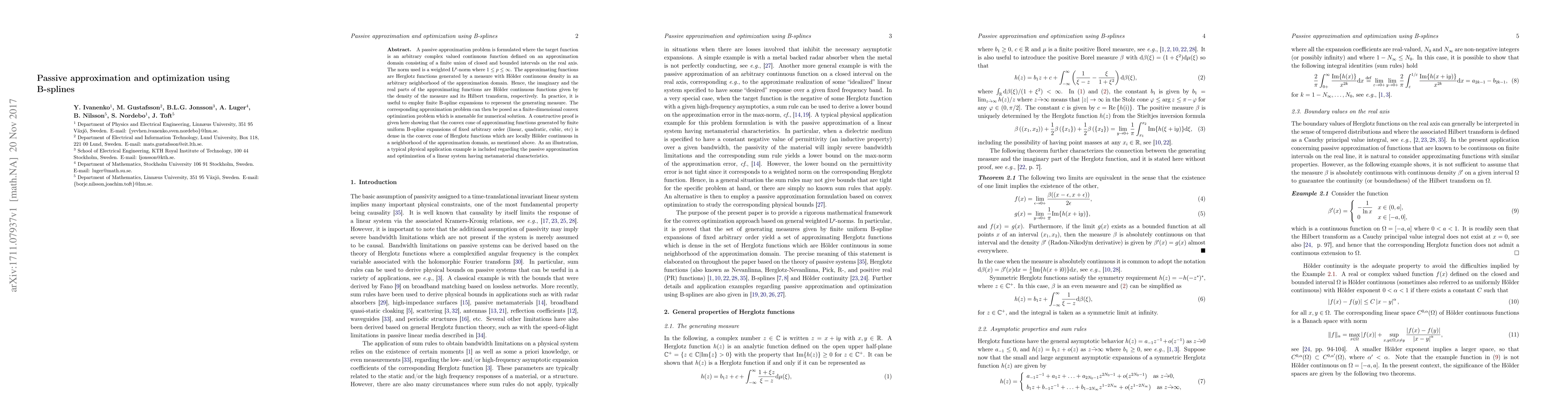 A passive approximation problem is formulated where the target function is an arbitrary complex valued continuous function defined on an approximation domain consisting of a finite union of closed and bounded intervals on the real axis. The norm used is a weighted $\text{L}^p$-norm where $1\leq p\leq\infty$. The approximating functions are Herglotz functions generated by a measure with H\"{o}lder continuous density in an arbitrary neighborhood of the approximation domain. Hence, the imaginary and the real parts of the approximating functions are H\"{o}lder continuous functions given by the density of the measure and its Hilbert transform, respectively. In practice, it is useful to employ finite B-spline expansions to represent the generating measure. The corresponding approximation problem can then be posed as a finite-dimensional convex optimization problem which is amenable for numerical solution. A constructive proof is given here showing that the convex cone of approximating functions generated by finite uniform B-spline expansions of fixed arbitrary order (linear, quadratic, cubic, etc) is dense in the convex cone of Herglotz functions which are locally H\"{o}lder continuous in a neighborhood of the approximation domain, as mentioned above. As an illustration, a typical physical application example is included regarding the passive approximation and optimization of a linear system having metamaterial characteristics.