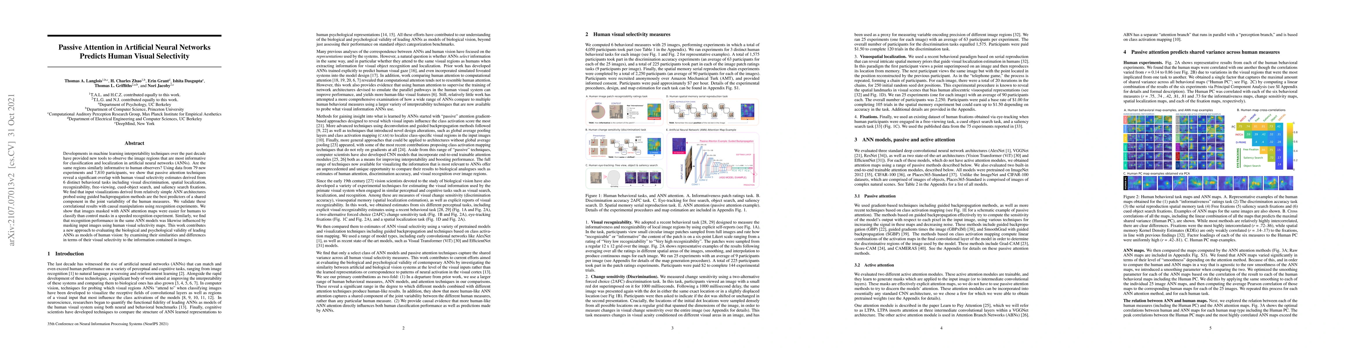 Developments in machine learning interpretability techniques over the past decade have provided new tools to observe the image regions that are most informative for classification and localization in artificial neural networks (ANNs). Are the same regions similarly informative to human observers? Using data from 79 new experiments and 7,810 participants, we show that passive attention techniques reveal a significant overlap with human visual selectivity estimates derived from 6 distinct behavioral tasks including visual discrimination, spatial localization, recognizability, free-viewing, cued-object search, and saliency search fixations. We find that input visualizations derived from relatively simple ANN architectures probed using guided backpropagation methods are the best predictors of a shared component in the joint variability of the human measures. We validate these correlational results with causal manipulations using recognition experiments. We show that images masked with ANN attention maps were easier for humans to classify than control masks in a speeded recognition experiment. Similarly, we find that recognition performance in the same ANN models was likewise influenced by masking input images using human visual selectivity maps. This work contributes a new approach to evaluating the biological and psychological validity of leading ANNs as models of human vision: by examining their similarities and differences in terms of their visual selectivity to the information contained in images.