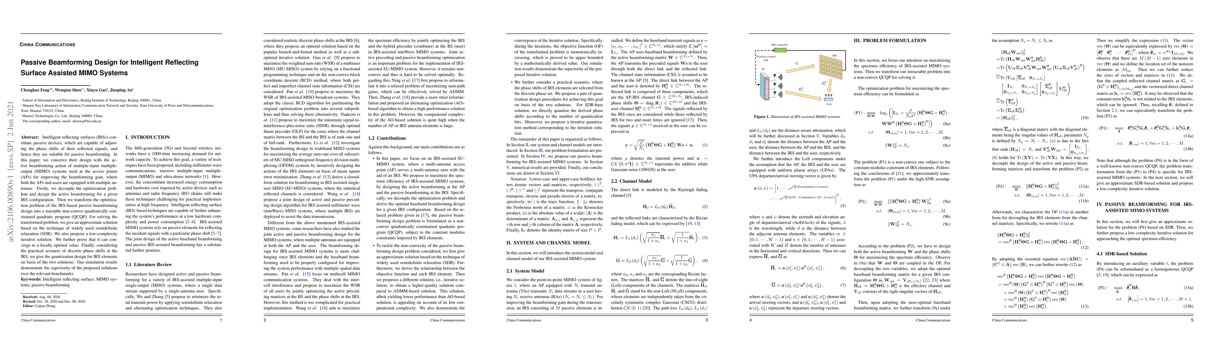This paper proposes a design for passive beamforming using intelligent reflecting surfaces (IRSs) in MIMO systems to enhance beamforming gain. It formulates the IRS optimization problem as a tractable non-convex QCQP, solves it using semidefinite relaxation and an iterative method, and provides quantization design for practical discrete phase shifts. Simulation results show the proposed solutions outperform benchmarks.