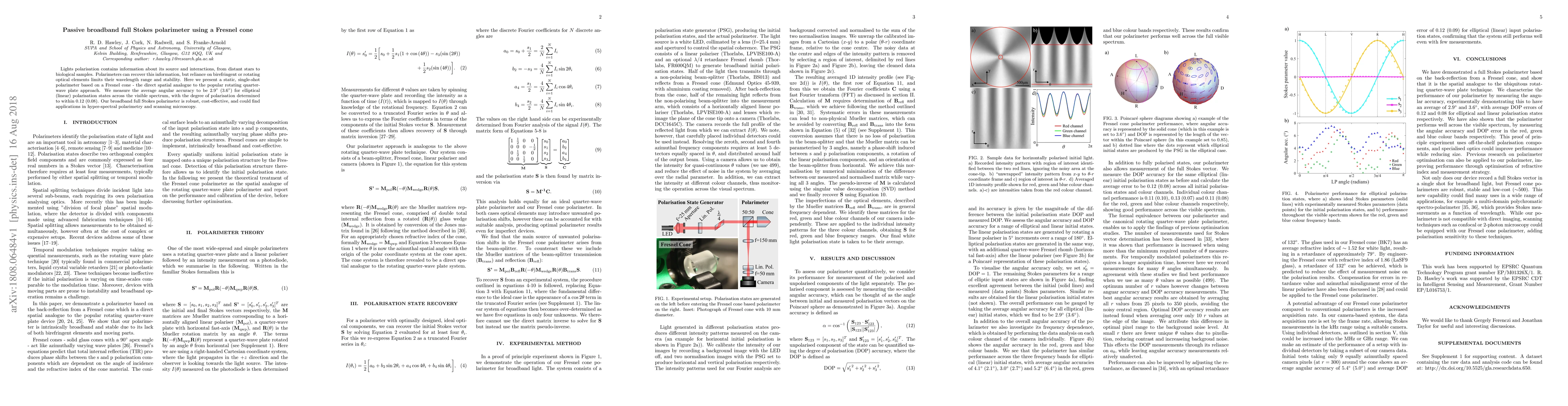 This paper introduces a novel broadband full Stokes polarimeter utilizing a Fresnel cone, offering a static, single-shot solution for polarization measurement. The device achieves high accuracy and stability, making it suitable for applications in hyper-spectral polarimetry and scanning microscopy.