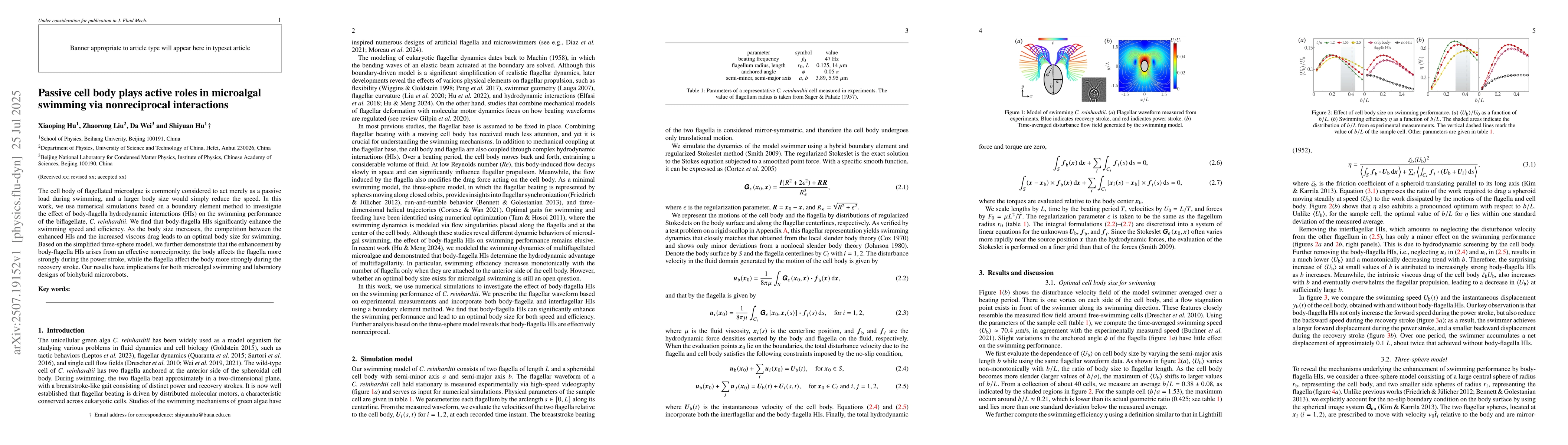 This research reveals that the cell body of microalgae like extit{C. reinhardtii} plays an active role in swimming via nonreciprocal interactions with flagella, enhancing swimming speed and efficiency. Numerical simulations based on boundary element method demonstrate an optimal body size for swimming due to a balance between enhanced hydrodynamic interactions and increased drag, with implications for microalgal swimming and biohybrid microrobot design.