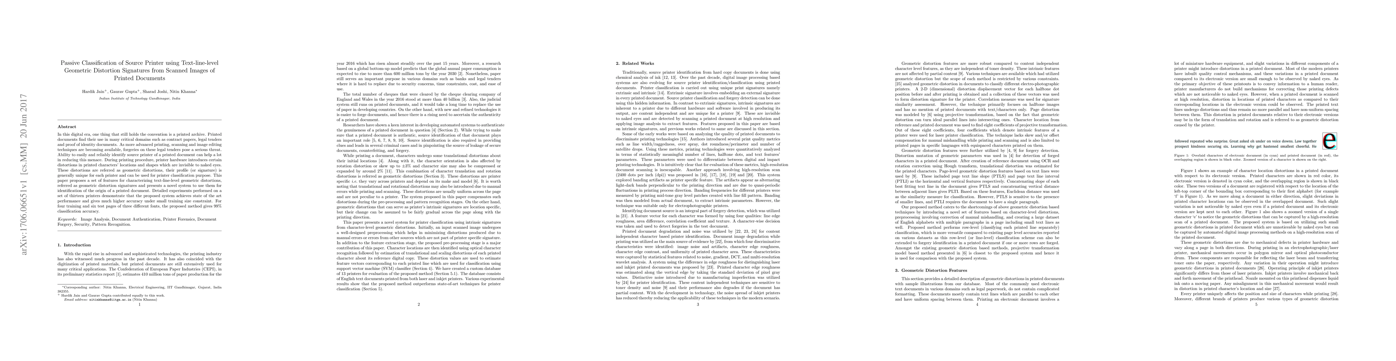 This paper proposes a method for identifying the source printer of printed documents based on text-line-level geometric distortion signatures extracted from scanned images. The system achieves state-of-the-art performance with 99% classification accuracy using minimal training data.