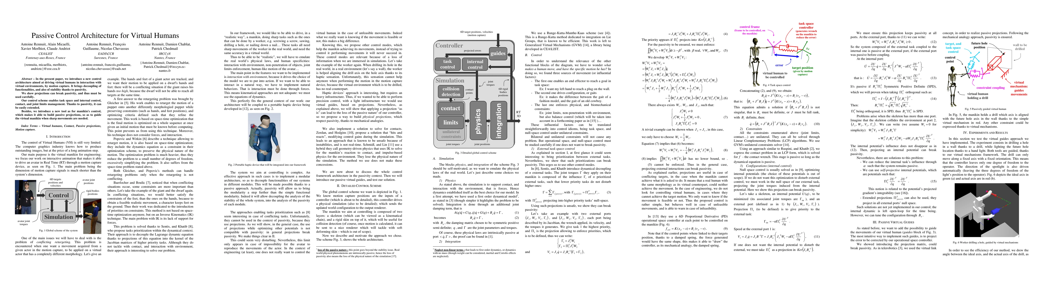 In the present paper, we introduce a new control architecture aimed at driving virtual humans in interaction with virtual environments, by motion capture. It brings decoupling of functionalities, and also of stability thanks to passivity. We show projections can break passivity, and thus must be used carefully. Our control scheme enables task space and internal control, contact, and joint limits management. Thanks to passivity, it can be easily extended. Besides, we introduce a new tool as for manikin's control, which makes it able to build passive projections, so as to guide the virtual manikin when sharp movements are needed.