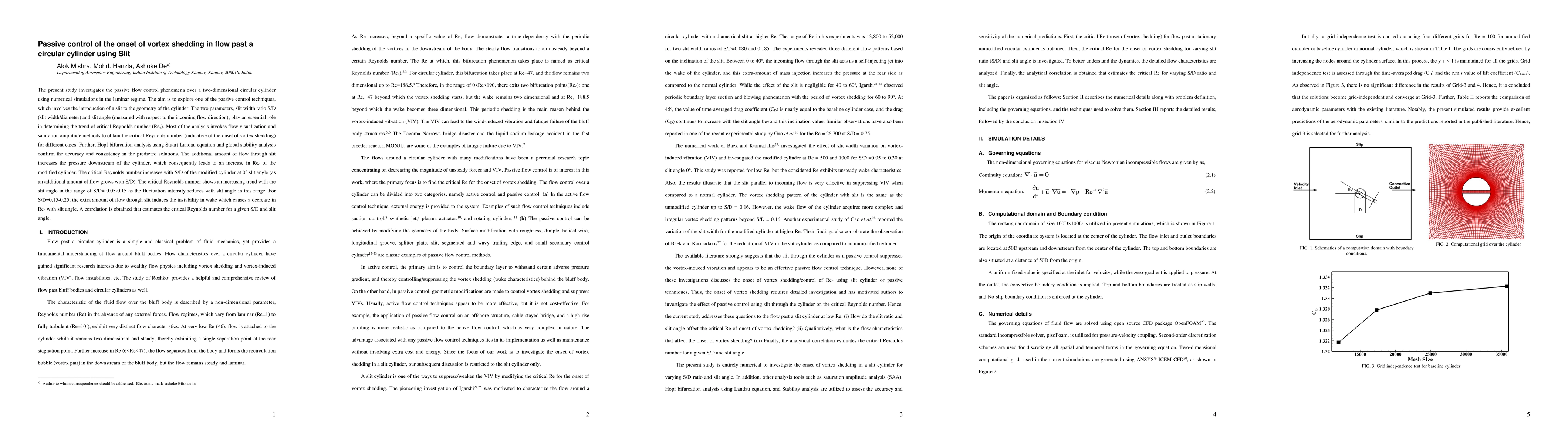 This study explores passive flow control over a circular cylinder using slit geometry, finding that slit width ratio and slit angle significantly influence the critical Reynolds number, delaying vortex shedding. The analysis confirms that increased slit width and angle can either raise or lower the critical Reynolds number, depending on the slit angle range.