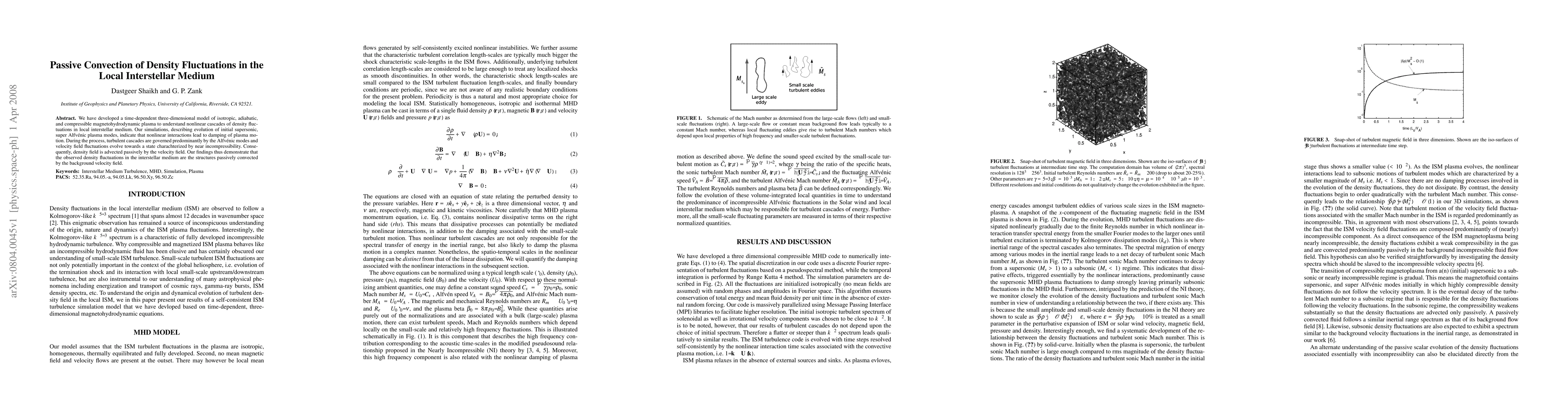 This paper develops a 3D model to simulate density fluctuations in the local interstellar medium, showing that nonlinear interactions cause damping of plasma motion. The study reveals that turbulent cascades are mainly driven by Alfv\'enic modes, leading to a near incompressibility of the velocity field and passive convection of density fluctuations by the background velocity field.