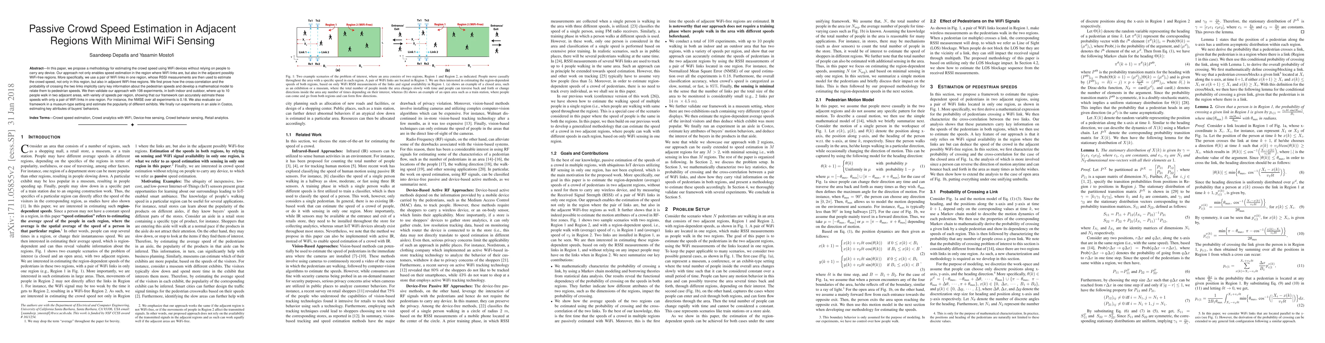 In this paper, we propose a methodology for estimating the crowd speed using WiFi devices without relying on people to carry any device. Our approach not only enables speed estimation in the region where WiFi links are, but also in the adjacent possibly WiFi-free regions. More specifically, we use a pair of WiFi links in one region, whose RSSI measurements are then used to estimate the crowd speed, not only in this region, but also in adjacent WiFi-free regions. We first prove how the cross-correlation and the probability of crossing the two links implicitly carry key information about the pedestrian speeds and develop a mathematical model to relate them to pedestrian speeds. We then validate our approach with 108 experiments, in both indoor and outdoor, where up to 10 people walk in two adjacent areas, with variety of speeds per region, showing that our framework can accurately estimate these speeds with only a pair of WiFi links in one region. For instance, the NMSE over all experiments is 0.18. We also evaluate our framework in a museum-type setting and estimate the popularity of different exhibits. We finally run experiments in an aisle in Costco, estimating key attributes of buyers' behaviors.