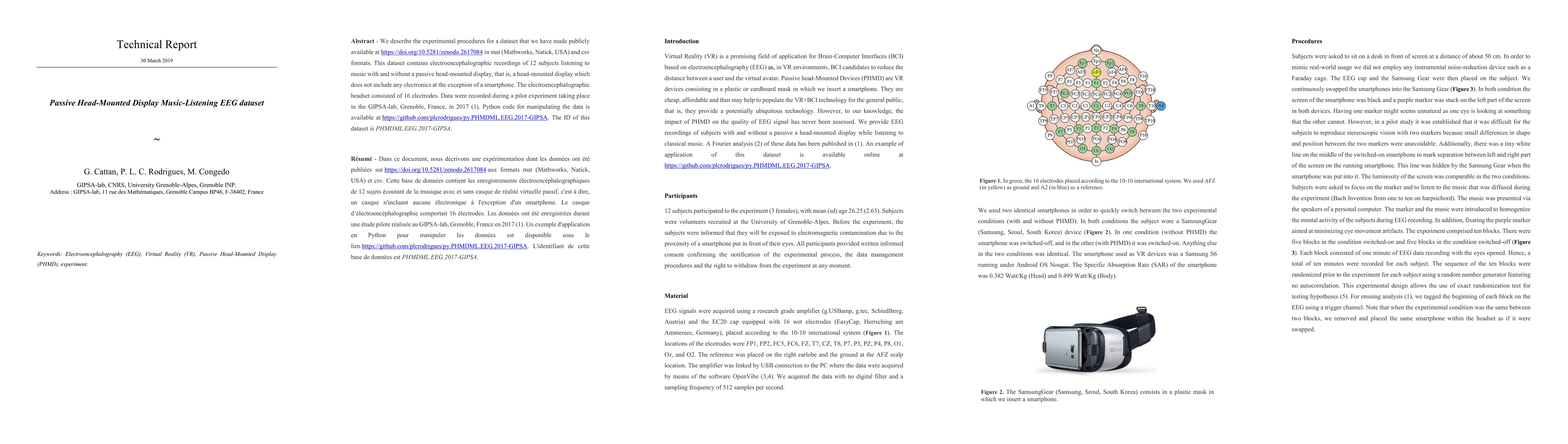We describe the experimental procedures for a dataset that we have made publicly available at https://doi.org/10.5281/zenodo.2617084 in mat (Mathworks, Natick, USA) and csv formats. This dataset contains electroencephalographic recordings of 12 subjects listening to music with and without a passive head-mounted display, that is, a head-mounted display which does not include any electronics at the exception of a smartphone. The electroencephalographic headset consisted of 16 electrodes. Data were recorded during a pilot experiment taking place in the GIPSA-lab, Grenoble, France, in 2017 (Cattan and al, 2018). Python code for manipulating the data is available at https://github.com/plcrodrigues/py.PHMDML.EEG.2017-GIPSA. The ID of this dataset is PHMDML.EEG.2017-GIPSA.