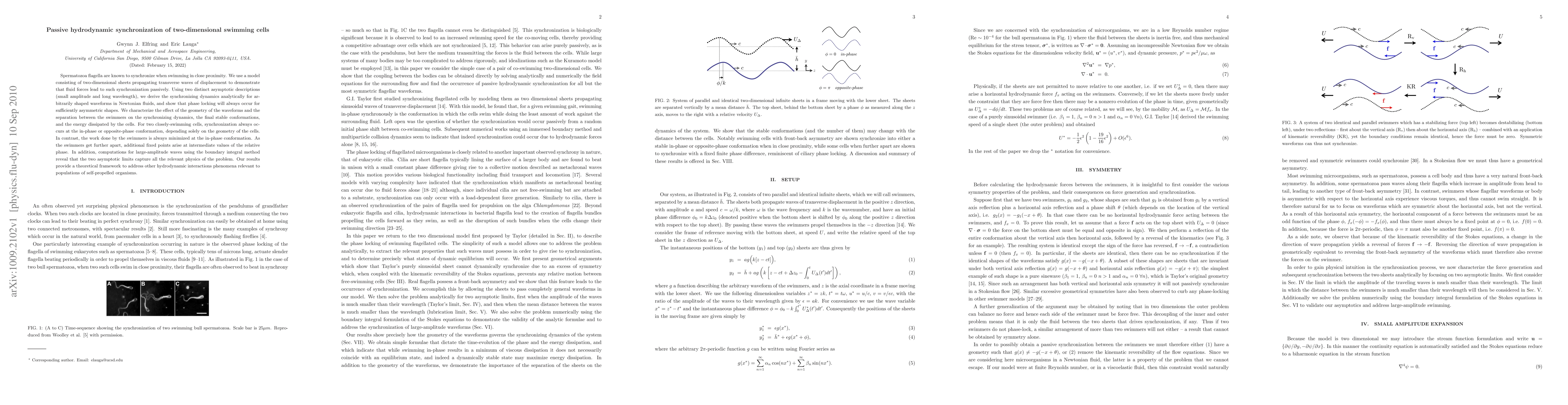 The work demonstrates passive hydrodynamic synchronization in two-dimensional swimming cells and provides a theoretical framework for addressing other hydrodynamic interactions phenomena.