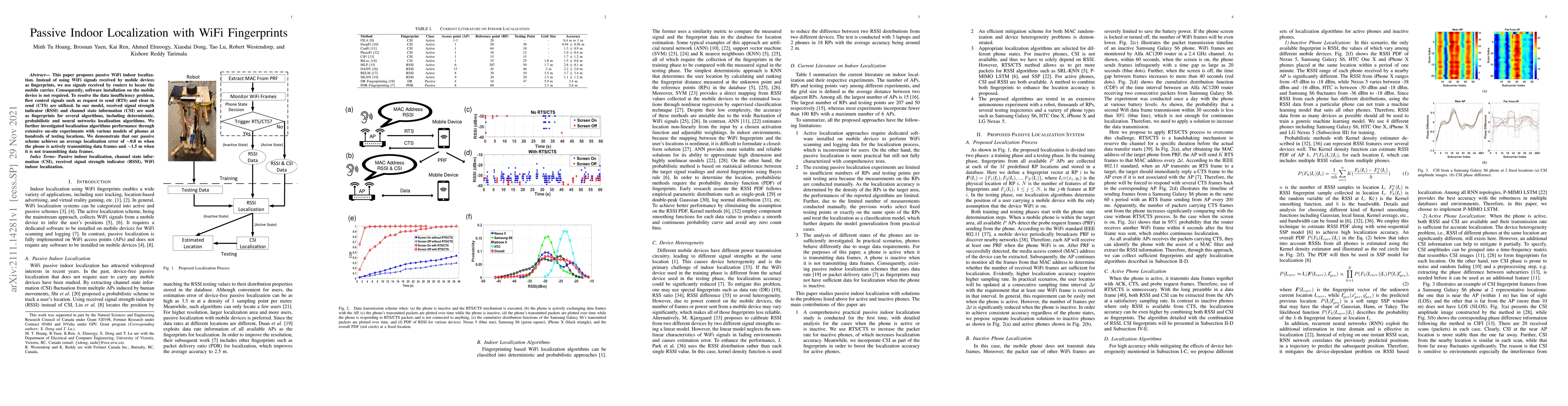 This paper proposes passive WiFi indoor localization. Instead of using WiFi signals received by mobile devices as fingerprints, we use signals received by routers to locate the mobile carrier. Consequently, software installation on the mobile device is not required. To resolve the data insufficiency problem, flow control signals such as request to send (RTS) and clear to send (CTS) are utilized. In our model, received signal strength indicator (RSSI) and channel state information (CSI) are used as fingerprints for several algorithms, including deterministic, probabilistic and neural networks localization algorithms. We further investigated localization algorithms performance through extensive on-site experiments with various models of phones at hundreds of testing locations. We demonstrate that our passive scheme achieves an average localization error of 0.8 m when the phone is actively transmitting data frames and 1.5 m when it is not transmitting data frames.