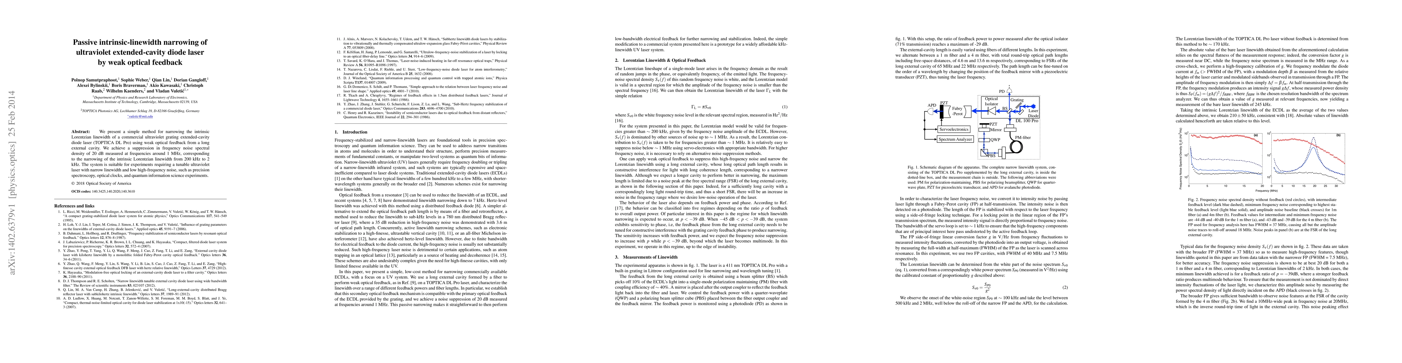 This paper details a technique to narrow the intrinsic linewidth of a commercial ultraviolet extended-cavity diode laser using weak optical feedback, achieving a 20 dB reduction in frequency noise and a linewidth narrowing from 200 kHz to 2 kHz. The method is applicable for precision spectroscopy and quantum information science experiments.