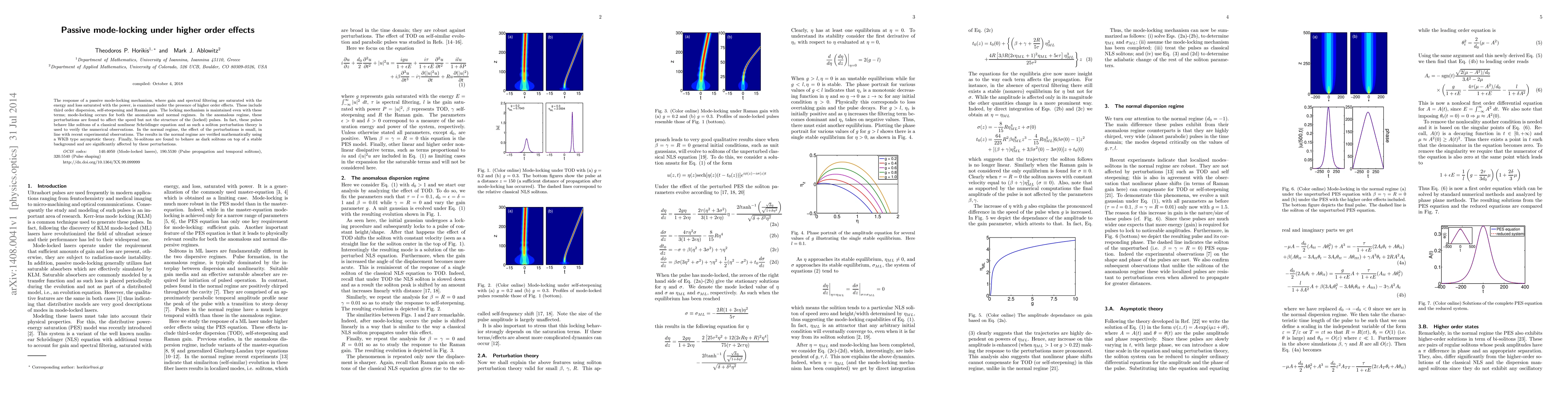 Researchers investigate how higher-order effects affect passive mode-locking mechanisms, finding that they preserve locking even with third-order dispersion, self-steepening, and Raman gain, while also discovering bi-solitons behave as dark solitons in certain regimes.