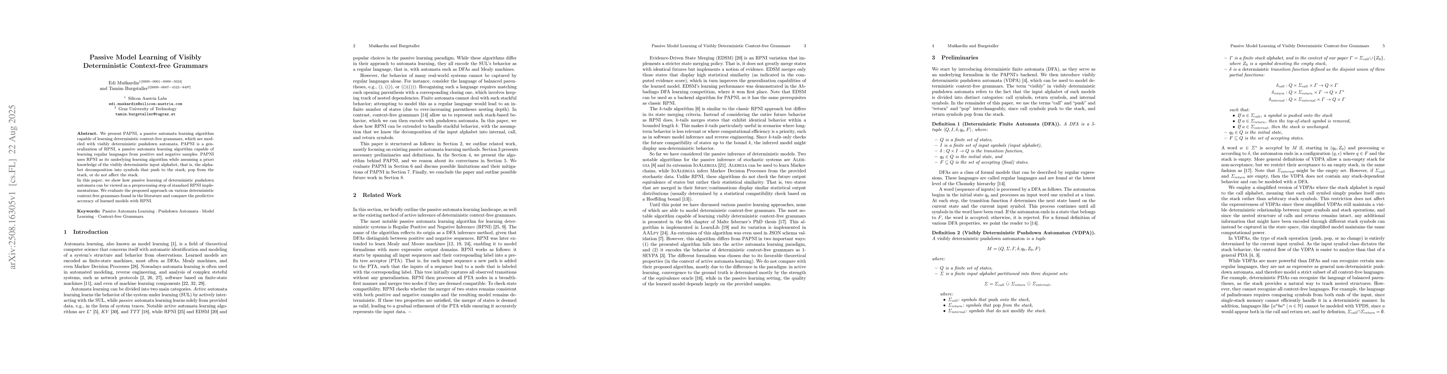 We present PAPNI, a passive automata learning algorithm capable of learning deterministic context-free grammars, which are modeled with visibly deterministic pushdown automata. PAPNI is a generalization of RPNI, a passive automata learning algorithm capable of learning regular languages from positive and negative samples. PAPNI uses RPNI as its underlying learning algorithm while assuming a priori knowledge of the visibly deterministic input alphabet, that is, the alphabet decomposition into symbols that push to the stack, pop from the stack, or do not affect the stack. In this paper, we show how passive learning of deterministic pushdown automata can be viewed as a preprocessing step of standard RPNI implementations. We evaluate the proposed approach on various deterministic context-free grammars found in the literature and compare the predictive accuracy of learned models with RPNI.