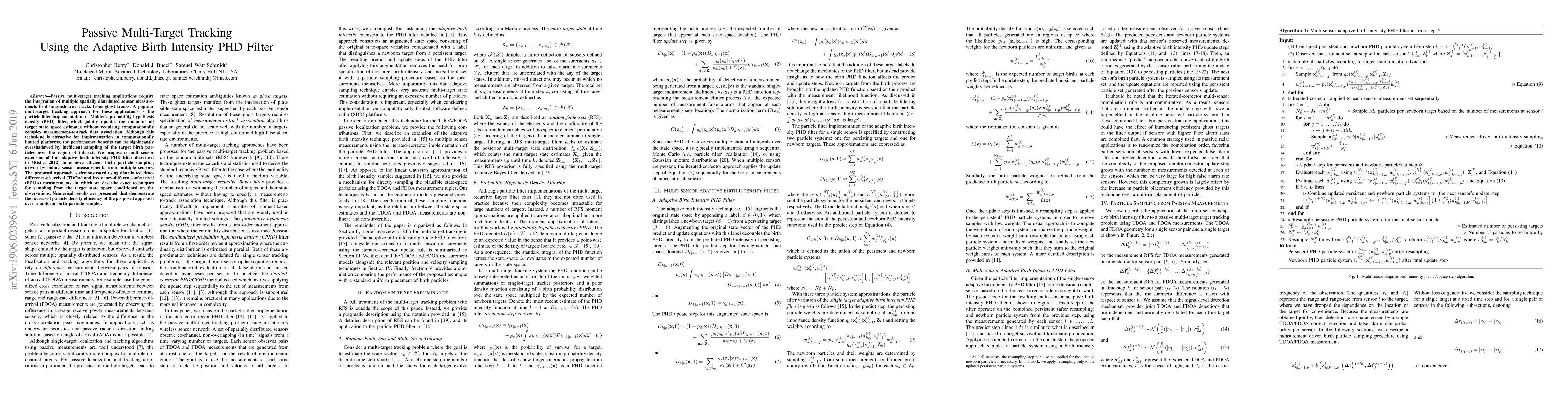 This paper proposes an adaptive birth intensity PHD filter for passive multi-target tracking using multiple sensors, aiming to improve sampling efficiency over uniform methods. The approach leverages online sensor measurements to enhance birth particle sampling, demonstrated through distributed TDOA and FDOA measurements.