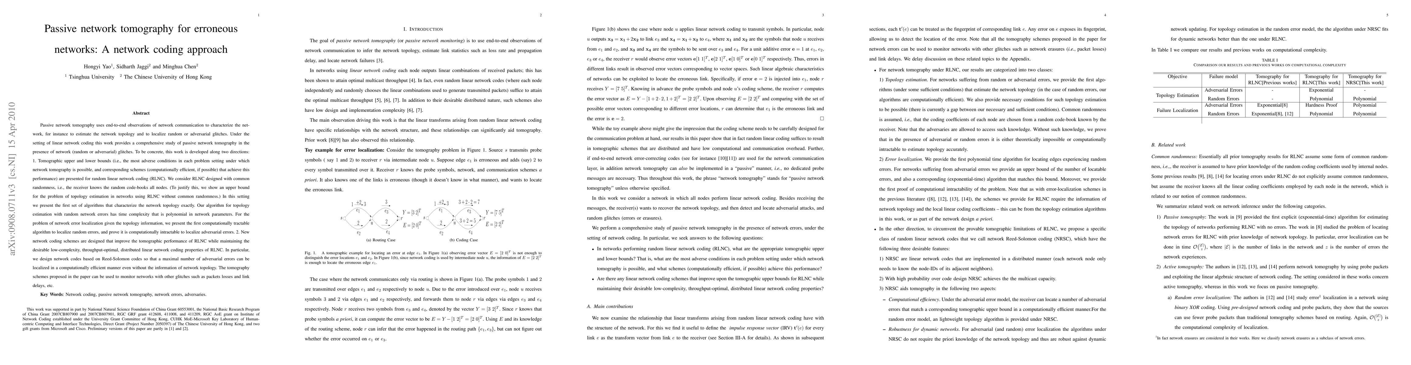 Passive network tomography uses end-to-end observations of network communication to characterize the network, for instance to estimate the network topology and to localize random or adversarial glitches. Under the setting of linear network coding this work provides a comprehensive study of passive network tomography in the presence of network (random or adversarial) glitches. To be concrete, this work is developed along two directions: 1. Tomographic upper and lower bounds (i.e., the most adverse conditions in each problem setting under which network tomography is possible, and corresponding schemes (computationally efficient, if possible) that achieve this performance) are presented for random linear network coding (RLNC). We consider RLNC designed with common randomness, i.e., the receiver knows the random code-books all nodes. (To justify this, we show an upper bound for the problem of topology estimation in networks using RLNC without common randomness.) In this setting we present the first set of algorithms that characterize the network topology exactly. Our algorithm for topology estimation with random network errors has time complexity that is polynomial in network parameters. For the problem of network error localization given the topology information, we present the first computationally tractable algorithm to localize random errors, and prove it is computationally intractable to localize adversarial errors. 2. New network coding schemes are designed that improve the tomographic performance of RLNC while maintaining the desirable low-complexity, throughput-optimal, distributed linear network coding properties of RLNC. In particular, we design network codes based on Reed-Solomon codes so that a maximal number of adversarial errors can be localized in a computationally efficient manner even without the information of network topology.