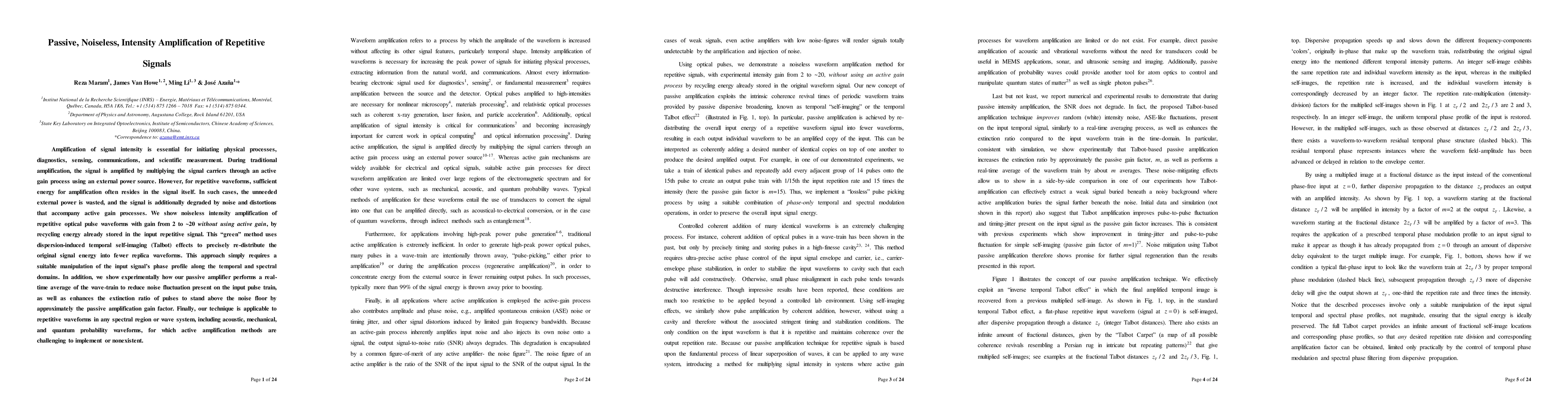 This paper presents a passive, noiseless method for amplifying repetitive optical pulse waveforms by recycling inherent signal energy, achieving gains up to 20 without active gain processes. The technique leverages dispersion-induced self-imaging effects to redistribute signal energy and reduce noise, applicable across various spectral regions and wave systems.
