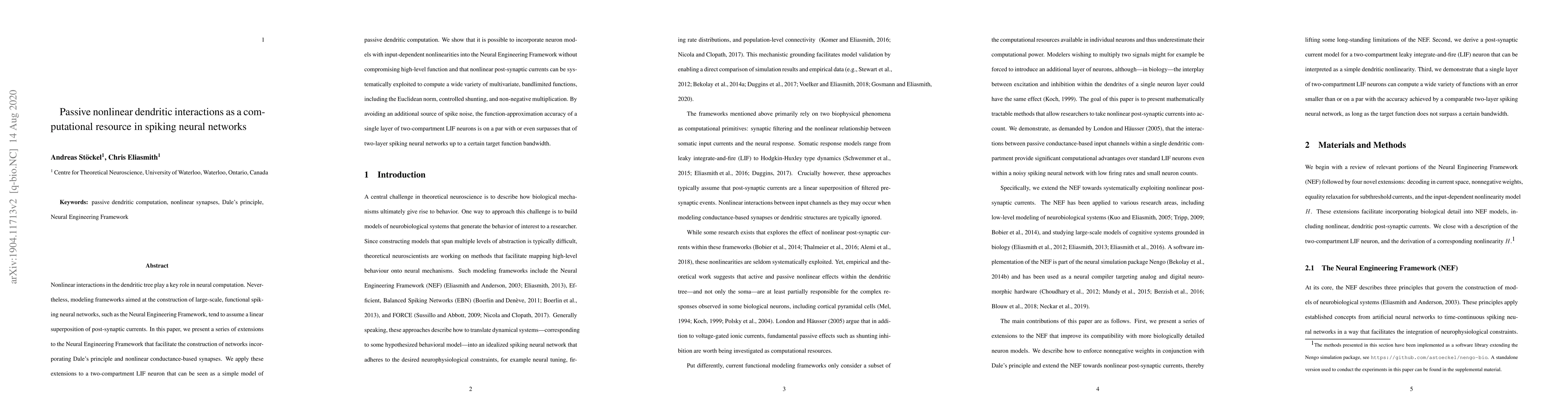 Nonlinear interactions in the dendritic tree play a key role in neural computation. Nevertheless, modeling frameworks aimed at the construction of large-scale, functional spiking neural networks, such as the Neural Engineering Framework, tend to assume a linear superposition of post-synaptic currents. In this paper, we present a series of extensions to the Neural Engineering Framework that facilitate the construction of networks incorporating Dale's principle and nonlinear conductance-based synapses. We apply these extensions to a two-compartment LIF neuron that can be seen as a simple model of passive dendritic computation. We show that it is possible to incorporate neuron models with input-dependent nonlinearities into the Neural Engineering Framework without compromising high-level function and that nonlinear post-synaptic currents can be systematically exploited to compute a wide variety of multivariate, bandlimited functions, including the Euclidean norm, controlled shunting, and non-negative multiplication. By avoiding an additional source of spike noise, the function-approximation accuracy of a single layer of two-compartment LIF neurons is on a par with or even surpasses that of two-layer spiking neural networks up to a certain target function bandwidth.