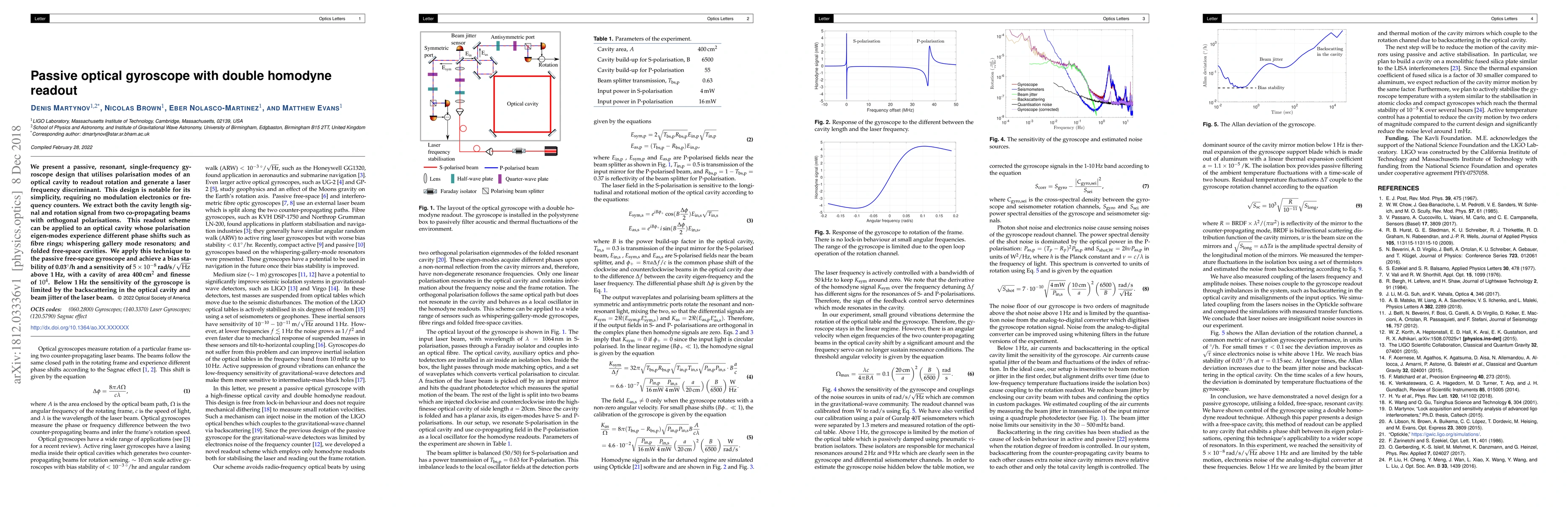 This paper introduces a simple passive optical gyroscope using double homodyne readout and polarization modes in an optical cavity, achieving a bias stability of 0.03 degree/h and a sensitivity of $5 \times 10^{-8}$ rad/sqHz above 1 Hz. The design avoids modulation electronics and frequency counters.