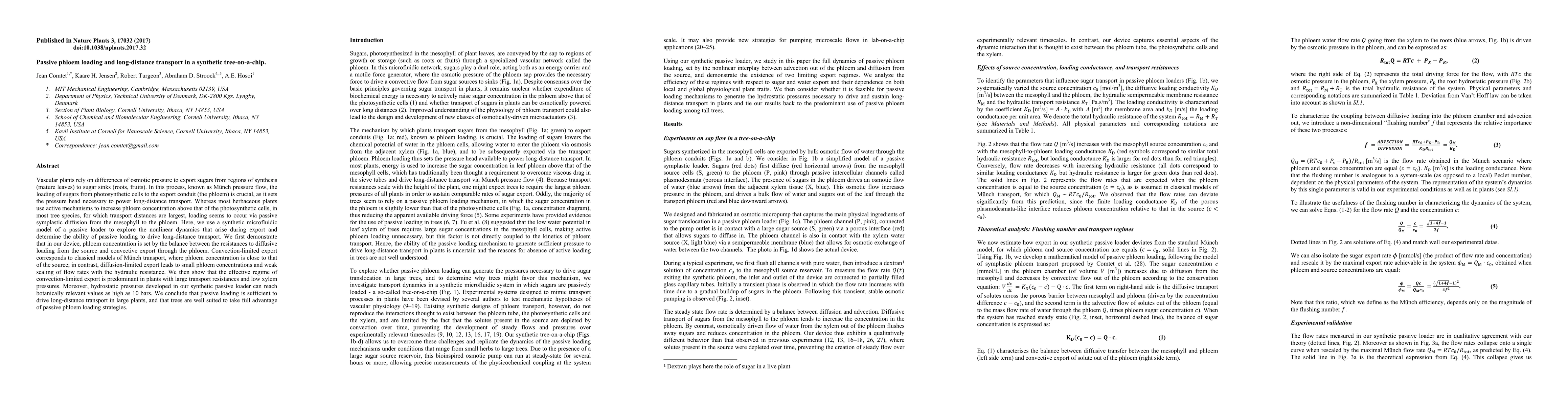 Vascular plants rely on differences of osmotic pressure to export sugars from regions of synthesis (mature leaves) to sugar sinks (roots, fruits). In this process, known as M\"unch pressure flow, the loading of sugars from photosynthetic cells to the export conduit (the phloem) is crucial, as it sets the pressure head necessary to power long-distance transport. Whereas most herbaceous plants use active mechanisms to increase phloem concentration above that of the photosynthetic cells, in most tree species, for which transport distances are largest, loading seems to occur via passive symplastic diffusion from the mesophyll to the phloem. Here, we use a synthetic microfluidic model of a passive loader to explore the nonlinear dynamics that arise during export and determine the ability of passive loading to drive long-distance transport. We first demonstrate that in our device, phloem concentration is set by the balance between the resistances to diffusive loading from the source and convective export through the phloem. Convection-limited export corresponds to classical models of M\"unch transport, where phloem concentration is close to that of the source; in contrast, diffusion-limited export leads to small phloem concentrations and weak scaling of flow rates with the hydraulic resistance. We then show that the effective regime of convection-limited export is predominant in plants with large transport resistances and low xylem pressures. Moreover, hydrostatic pressures developed in our synthetic passive loader can reach botanically relevant values as high as 10 bars. We conclude that passive loading is sufficient to drive long-distance transport in large plants, and that trees are well suited to take full advantage of passive phloem loading strategies.