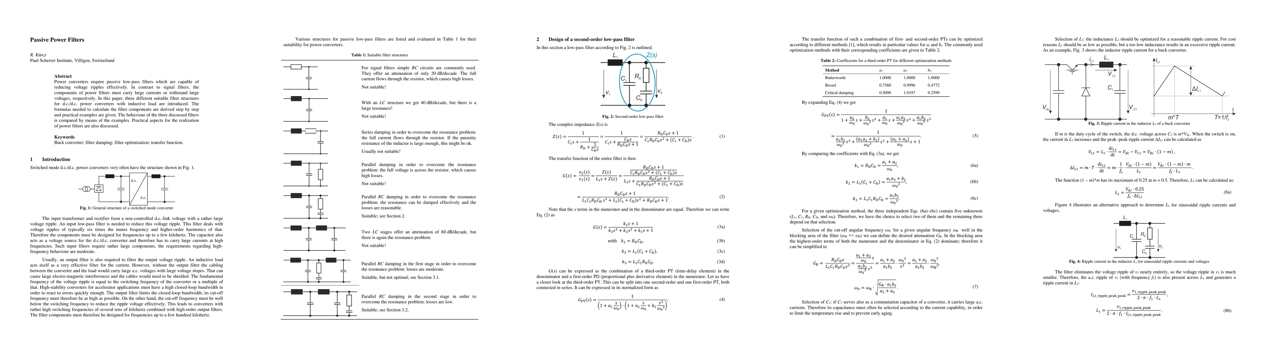 This paper introduces three passive low-pass filter structures for d.c./d.c. power converters, deriving formulas for component calculations and comparing their performance through practical examples. Practical aspects for implementing these filters are also discussed.