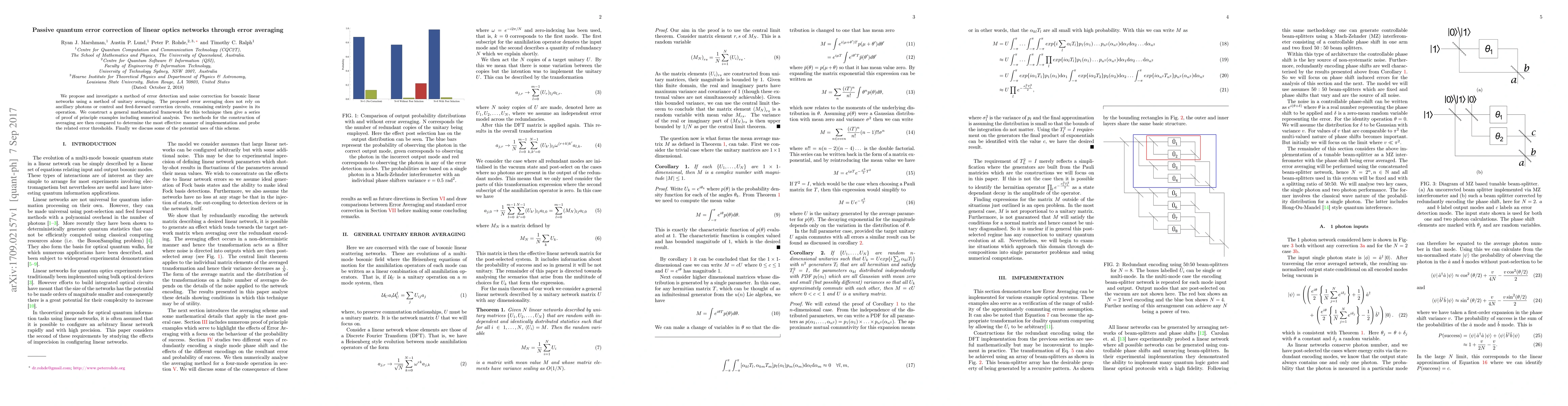 The research proposes a method of error detection and noise correction for bosonic linear networks using unitary averaging, which operates passively without ancillary photons or control and feed-forward correction circuits.