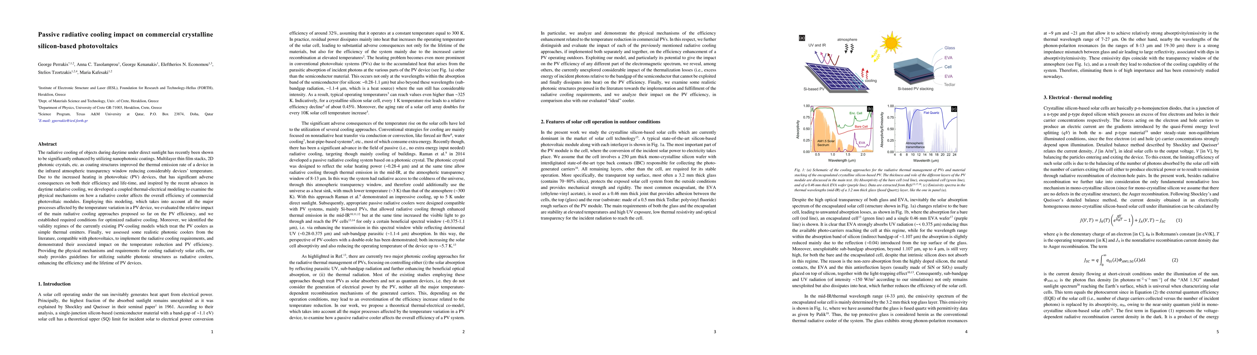 This paper explores how passive radiative cooling using nanophotonic coatings can enhance the efficiency and lifetime of commercial crystalline silicon-based photovoltaics by reducing device temperature. The study develops a coupled thermal-electrical model to evaluate the impact of various radiative cooling techniques on PV efficiency and identifies optimal conditions for effective cooling.