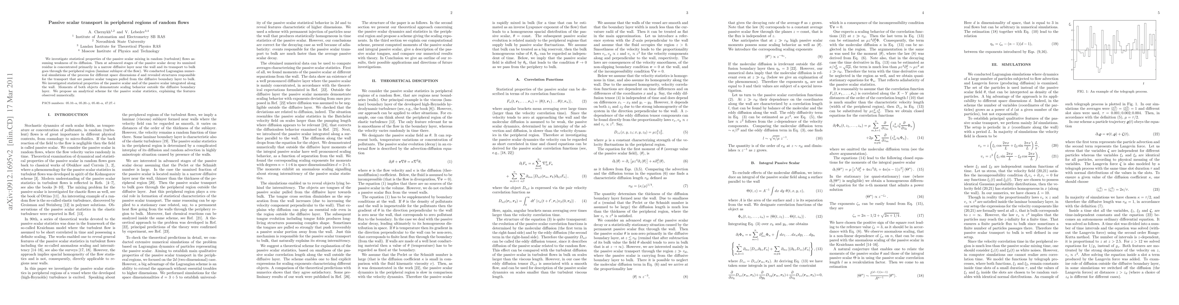 We investigate statistical properties of the passive scalar near boundaries (walls) in random (turbulent) flows assuming weakness of its diffusion. Then at advanced stages of the passive scalar mixing its unmixed residue is concentrated in a narrow diffusive layer near the wall and its transport to bulk goes through the peripheral region (laminar sublayer). We conducted Lagrangian numerical simulations of the process for different space dimensions $d$ and revealed structures responsible for the transport that are passive scalar tongues pulled from the diffusive boundary layer to bulk. We investigated statistical properties of the passive scalar and of the passive scalar integrated along the wall. Moments of both objects demonstrate scaling behavior outside the diffusive boundary layer. We propose an analytical scheme for explanation scaling of the passive scalar, the obtained exponents agree reasonably with numerics in 3d.