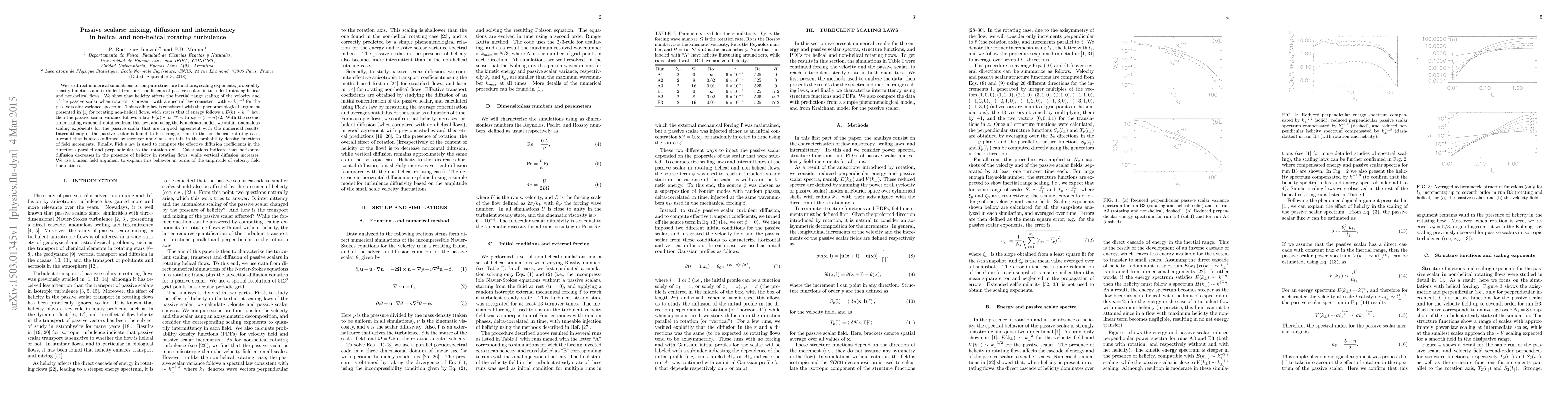 This paper investigates passive scalar mixing and diffusion in turbulent rotating flows using direct numerical simulations, revealing that helicity influences the inertial range scaling and intermittency of passive scalars. The study finds that horizontal diffusion decreases while vertical diffusion increases in helical flows, explained by the amplitude of velocity field fluctuations.