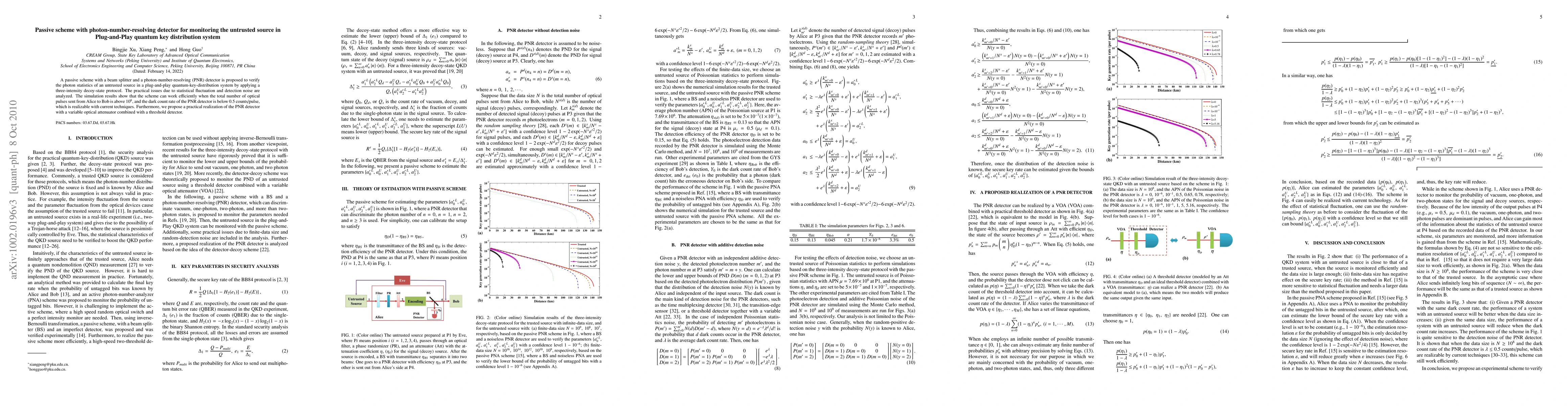 This paper proposes a passive scheme using a beam splitter and a photon-number-resolving detector to verify the photon statistics of an untrusted source in a quantum-key-distribution system. The scheme employs a three-intensity decoy-state protocol to address practical issues like statistical fluctuation and detection noise, demonstrating efficiency under certain conditions.