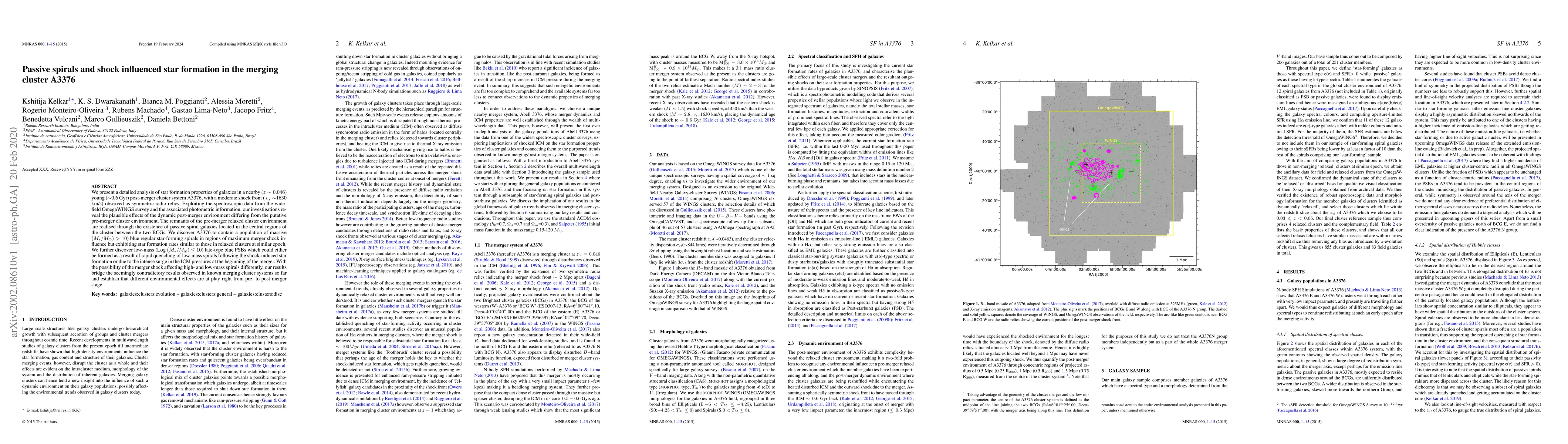This study analyzes star formation in a post-merger galaxy cluster, revealing that massive blue spirals form under shock influence but with similar star formation rates to relaxed clusters, while low-mass spirals may be quenched or formed by intense pressure surges.