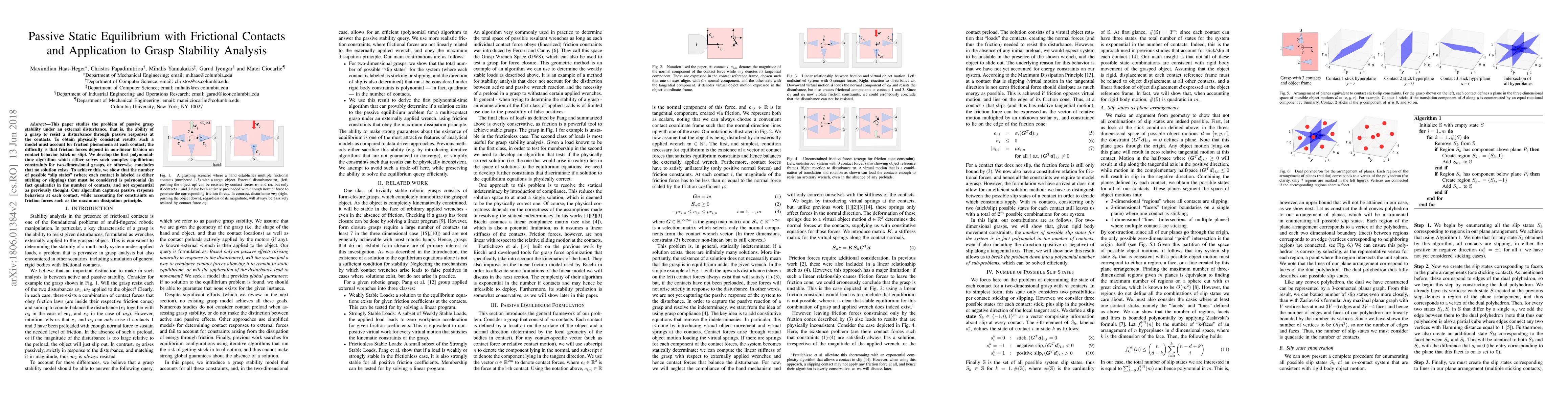 This paper studies the problem of passive grasp stability under an external disturbance, that is, the ability of a grasp to resist a disturbance through passive responses at the contacts. To obtain physically consistent results, such a model must account for friction phenomena at each contact; the difficulty is that friction forces depend in non-linear fashion on contact behavior (stick or slip). We develop the first polynomial-time algorithm which either solves such complex equilibrium constraints for two-dimensional grasps, or otherwise concludes that no solution exists. To achieve this, we show that the number of possible `slip states' (where each contact is labeled as either sticking or slipping) that must be considered is polynomial (in fact quadratic) in the number of contacts, and not exponential as previously thought. Our algorithm captures passive response behaviors at each contact, while accounting for constraints on friction forces such as the maximum dissipation principle.