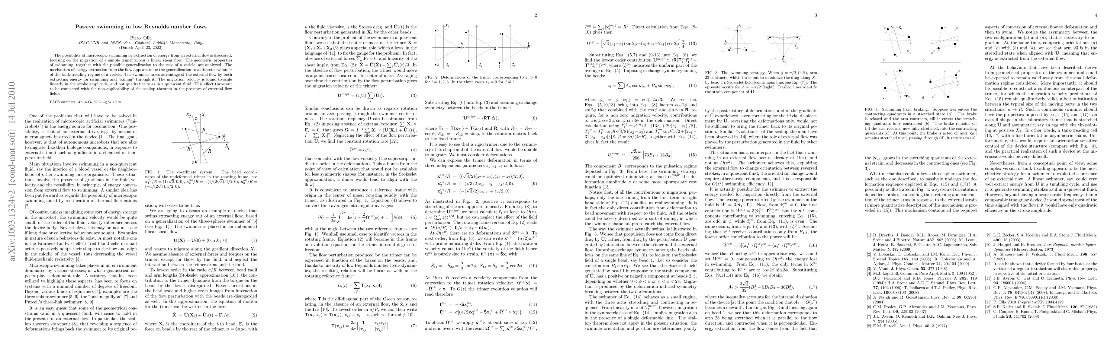 The possibility of microscopic swimming by extraction of energy from an external flow is discussed, focusing on the migration of a simple trimer across a linear shear flow. The geometric properties of swimming, together with the possible generalization to the case of a vesicle, are analyzed.The mechanism of energy extraction from the flow appears to be the generalization to a discrete swimmer of the tank-treading regime of a vesicle. The swimmer takes advantage of the external flow by both extracting energy for swimming and "sailing" through it. The migration velocity is found to scale linearly in the stroke amplitude, and not quadratically as in a quiescent fluid. This effect turns out to be connected with the non-applicability of the scallop theorem in the presence of external flow fields.