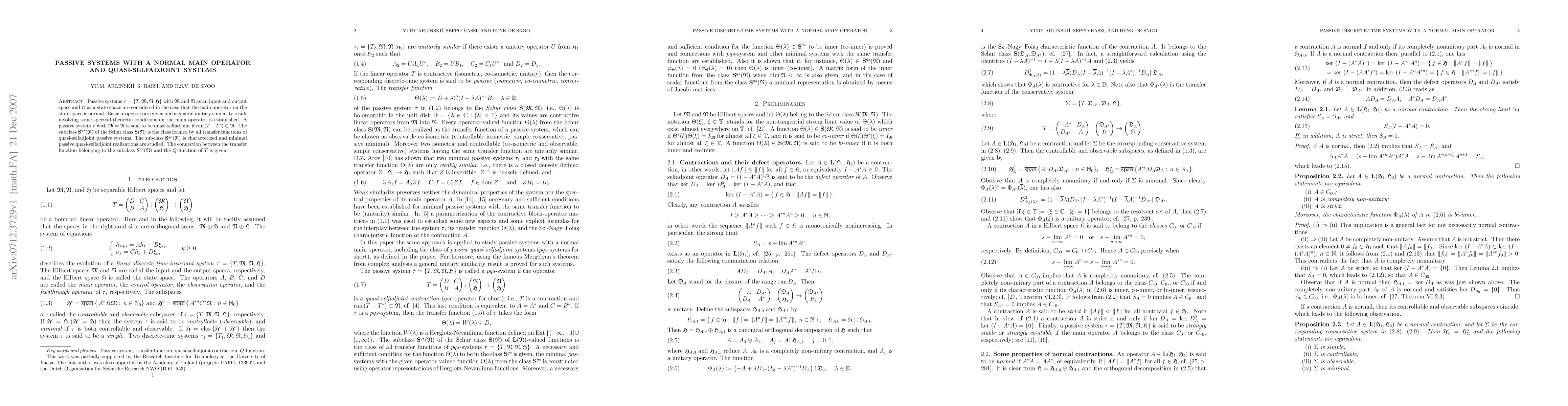 This paper explores passive systems with a normal main operator, establishing unitary similarity results under spectral conditions. It introduces quasi-selfadjoint passive systems and characterizes the subclass $S^{qs}$ of the Schur class, focusing on minimal realizations and connections to $Q$-functions.