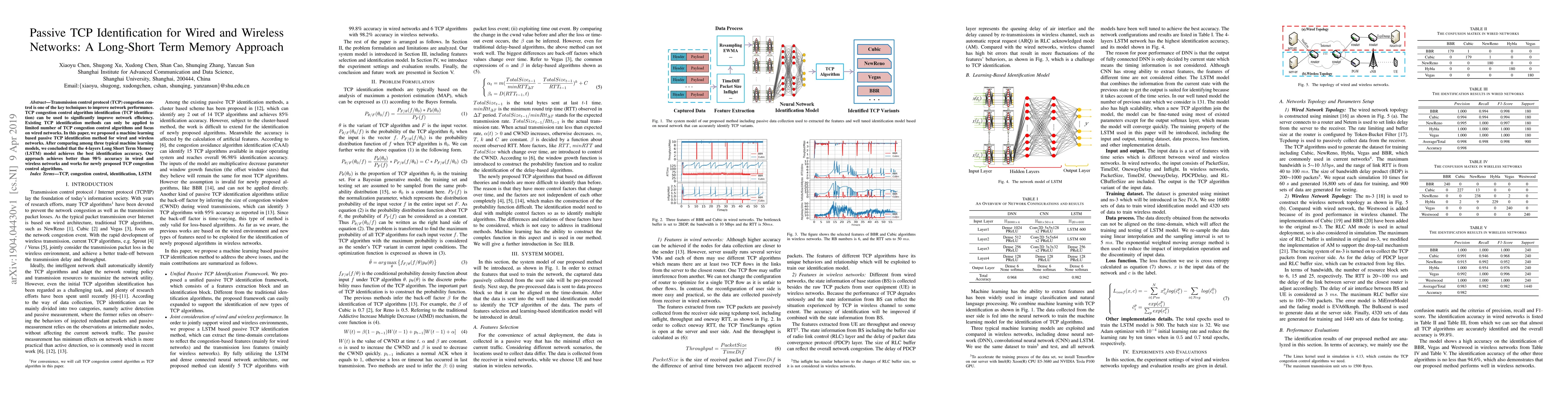 This paper proposes a machine learning-based passive TCP identification method using a 4-layer Long Short Term Memory (LSTM) model, achieving over 98% accuracy for both wired and wireless networks. The approach is effective for identifying newly proposed TCP congestion control algorithms.
